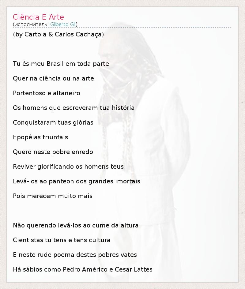 (by Cartola & Carlos Cachaça) Tu és meu Brasil em toda parte Quer na ciência ou na arte Portentoso e altaneiro Os homens que escreveram tua história Conquistaram tuas glórias Epopéias triunfais Quero neste pobre enredo Reviver glorificando os homens teus Levá-los ao panteon dos grandes imortais Pois merecem muito mais Não querendo levá-los ao cume da altura Cientistas tu tens e tens cultura E neste rude poema destes pobres vates Há sábios como Pedro Américo e Cesar Lattes