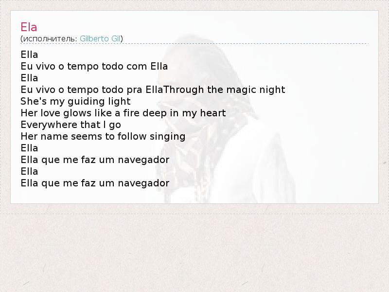 Это интересно:Один из основателей экспрессивного бразильского музыкального стиля "тропикализм" Жилберту Жил входит в число самых любимых на родине музыкантов. Музыкант с ангельским голосом и дьявольским темпераментом, как назвал его один из критиков. На "Глобо" постоянно используется его музыка, он входит в число наиболее "цитируемых" сериалами музыкантов. В сериале "Берег мечты"... продолжение