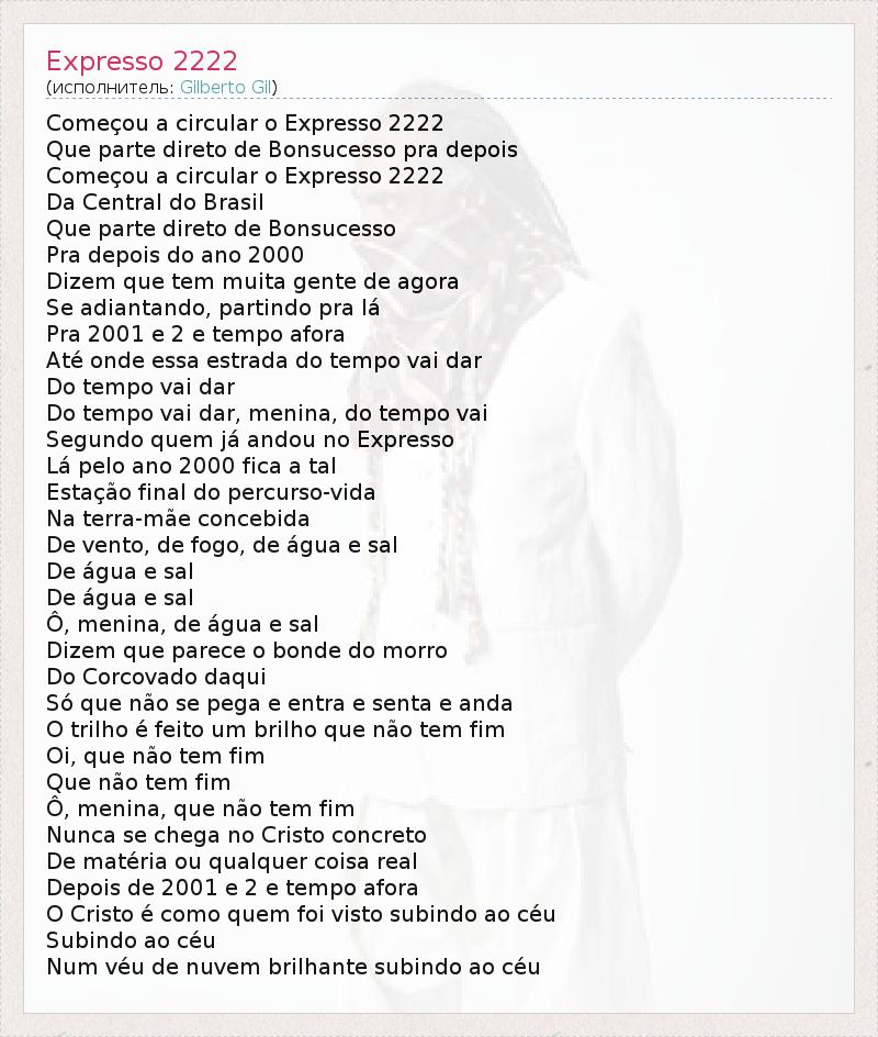 Começou a circular o Expresso 2222 Que parte direto de Bonsucesso pra depois Começou a circular o Expresso 2222 Da Central do Brasil Que parte direto de Bonsucesso Pra depois do ano 2000 Dizem que tem muita gente de agora Se adiantando, partindo pra lá Pra 2001 e 2 e tempo afora Até onde essa estrada do tempo vai dar Do tempo vai dar Do tempo vai dar, menina, do tempo vai Segundo quem já andou no Expresso Lá pelo ano 2000 fica a tal Estação final do percurso-vida Na terra-mãe concebida De vento, de fogo, de água e sal De água e sal De água e sal Ô, menina, de água e sal Dizem que parece o bonde do morro Do Corcovado daqui Só que não se pega e entra e senta e anda O trilho é feito um brilho que não tem fim Oi, que não tem fim Que não tem fim Ô, menina, que não tem fim Nunca se chega no Cristo concreto De matéria ou qualquer coisa real Depois de 2001 e 2 e tempo afora O Cristo é como quem foi visto subindo ao céu Subindo ao céu Num véu de nuvem brilhante subindo ao céu