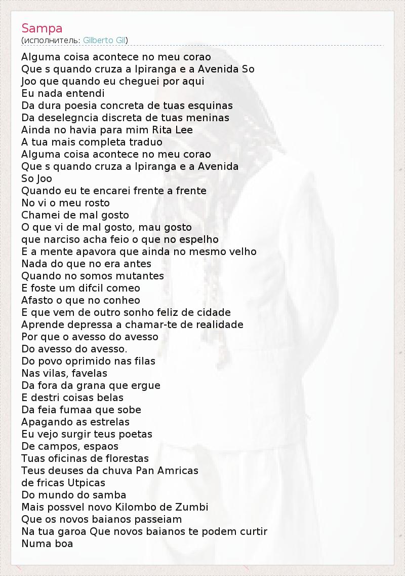 Это интересно:Один из основателей экспрессивного бразильского музыкального стиля "тропикализм" Жилберту Жил входит в число самых любимых на родине музыкантов. Музыкант с ангельским голосом и дьявольским темпераментом, как назвал его один из критиков. На "Глобо" постоянно используется его музыка, он входит в число наиболее "цитируемых" сериалами музыкантов. В сериале "Берег мечты"... продолжение