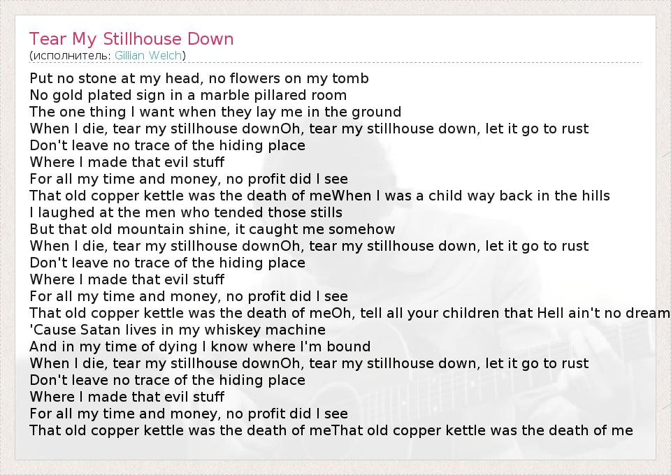 А как ты думаешь, о чем песня "Tear My Stillhouse Down" ?
