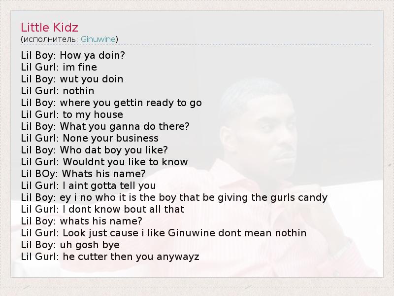 Lil Boy: How ya doin? Lil Gurl: im fine Lil Boy: wut you doin Lil Gurl: nothin Lil Boy: where you gettin ready to go Lil Gurl: to my house Lil Boy: What you ganna do there? Lil Gurl: None your business Lil Boy: Who dat boy you like? Lil Gurl: Wouldnt you like to know Lil BOy: Whats his name? Lil Gurl: I aint gotta tell you Lil Boy: ey i no who it is the boy that be giving the gurls candy Lil Gurl: I dont know bout all that Lil Boy: whats his name? Lil Gurl: Look just cause i like Ginuwine dont mean nothin Lil Boy: uh gosh bye Lil Gurl: he cutter then you anywayz
