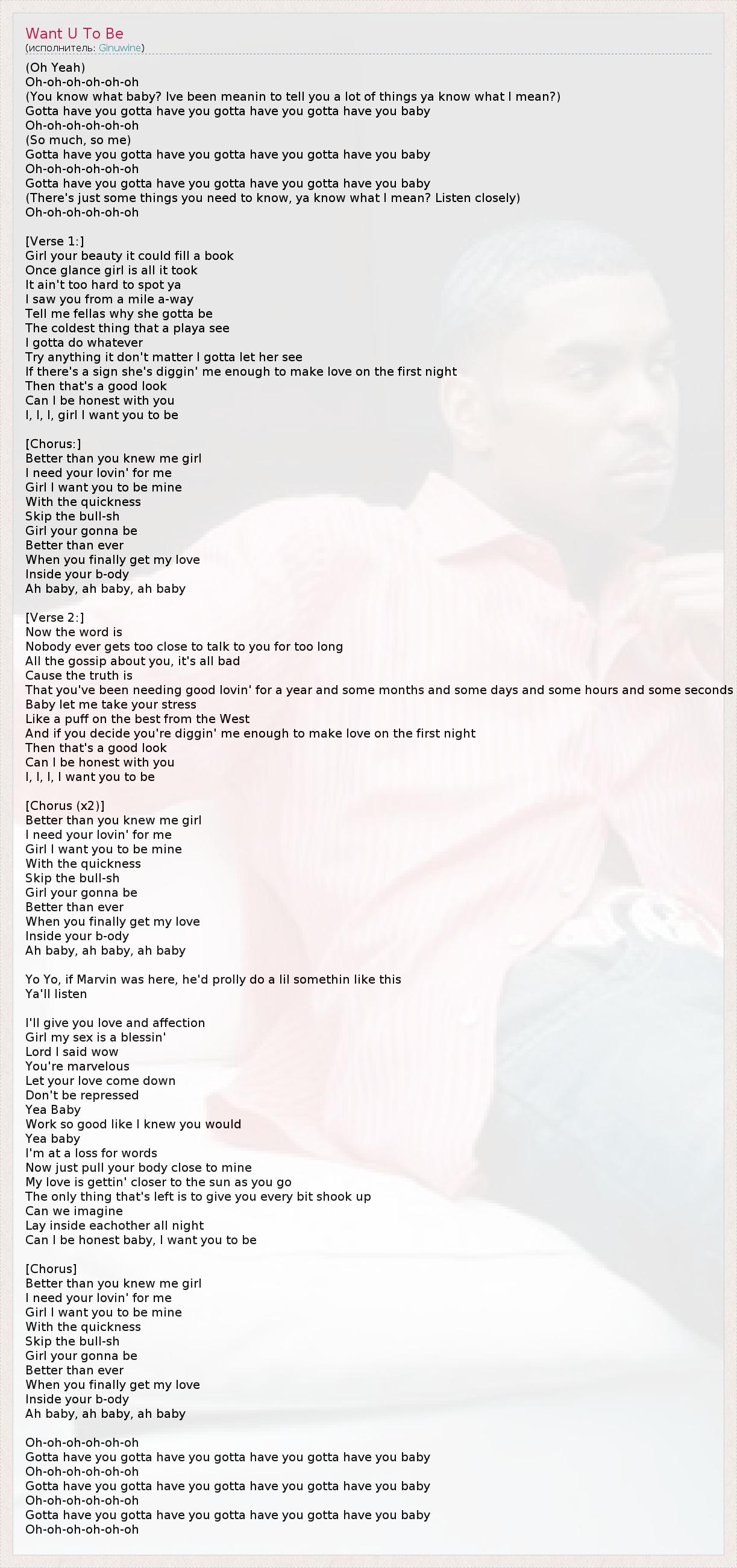 (Oh Yeah) Oh-oh-oh-oh-oh-oh (You know what baby? Ive been meanin to tell you a lot of things ya know what I mean?) Gotta have you gotta have you gotta have you gotta have you baby Oh-oh-oh-oh-oh-oh (So much, so me) Gotta have you gotta have you gotta have you gotta have you baby Oh-oh-oh-oh-oh-oh Gotta have you gotta have you gotta have you gotta have you baby (There's just some things you need to know, ya know what I mean? Listen closely) Oh-oh-oh-oh-oh-oh [Verse 1:] Girl your beauty it could fill a book Once glance girl is all it took It ain't too hard to spot ya I saw you from a mile a-way Tell me fellas why she gotta be The coldest thing that a playa see I gotta do whatever Try anything it don't matter I gotta let her see If there's a sign she's diggin' me enough to make love on the first night Then that's a good look Can I be honest with you I, I, I, girl I want you to be [Chorus:] Better than you knew me girl I need your lovin' for me Girl I want you to be mine With the quickness Skip the bull-sh Girl your gonna be Better than ever When you finally get my love Inside your b-ody Ah baby, ah baby, ah baby [Verse 2:] Now the word is Nobody ever gets too close to talk to you for too long All the gossip about you, it's all bad Cause the truth is That you've been needing good lovin' for a year and some months and some days and some hours and some seconds Baby let me take your stress Like a puff on the best from the West And if you decide you're diggin' me enough to make love on the first night Then that's a good look Can I be honest with you I, I, I, I want you to be [Chorus (x2)] Better than you knew me girl I need your lovin' for me Girl I want you to be mine With the quickness Skip the bull-sh Girl your gonna be Better than ever When you finally get my love Inside your b-ody Ah baby, ah baby, ah baby Yo Yo, if Marvin was here, he'd prolly do a lil somethin like this Ya'll listen I'll give you love and affection Girl my sex is a blessin' Lord I said wow You're marvelous Let your love come down Don't be repressed Yea Baby Work so good like I knew you would Yea baby I'm at a loss for words Now just pull your body close to mine My love is gettin' closer to the sun as you go The only thing that's left is to give you every bit shook up Can we imagine Lay inside eachother all night Can I be honest baby, I want you to be [Chorus] Better than you knew me girl I need your lovin' for me Girl I want you to be mine With the quickness Skip the bull-sh Girl your gonna be Better than ever When you finally get my love Inside your b-ody Ah baby, ah baby, ah baby Oh-oh-oh-oh-oh-oh Gotta have you gotta have you gotta have you gotta have you baby Oh-oh-oh-oh-oh-oh Gotta have you gotta have you gotta have you gotta have you baby Oh-oh-oh-oh-oh-oh Gotta have you gotta have you gotta have you gotta have you baby Oh-oh-oh-oh-oh-oh
