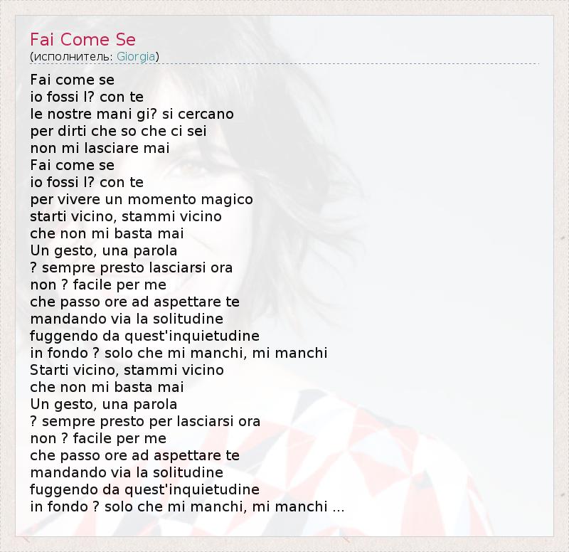 Fai come se io fossi l? con te le nostre mani gi? si cercano per dirti che so che ci sei non mi lasciare mai Fai come se io fossi l? con te per vivere un momento magico starti vicino, stammi vicino che non mi basta mai Un gesto, una parola ? sempre presto lasciarsi ora non ? facile per me che passo ore ad aspettare te mandando via la solitudine fuggendo da quest'inquietudine in fondo ? solo che mi manchi, mi manchi Starti vicino, stammi vicino che non mi basta mai Un gesto, una parola ? sempre presto per lasciarsi ora non ? facile per me che passo ore ad aspettare te mandando via la solitudine fuggendo da quest'inquietudine in fondo ? solo che mi manchi, mi manchi ...