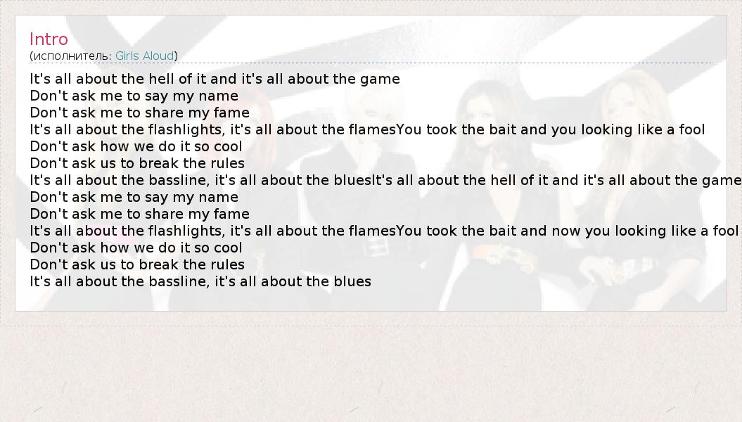 Это интересно:Girls Aloud — британская поп-группа, сформировавшаяся в 2002 году в ходе реалити-шоу канала ITV Popstars: The Rivals. В состав входят Шерил Коул, Сара Хардинг, Никола Робертс, Кимберли Уолш и Надин Койл. Группа выпустила 22 сингла, (21 из которых вошел в первую десятку UK Singles Chart и 4 его возглавили), пять студийных альбомов, два сборника лучших хитов и два альбома ремиксов (два альбома занимали первое место в UK... продолжение