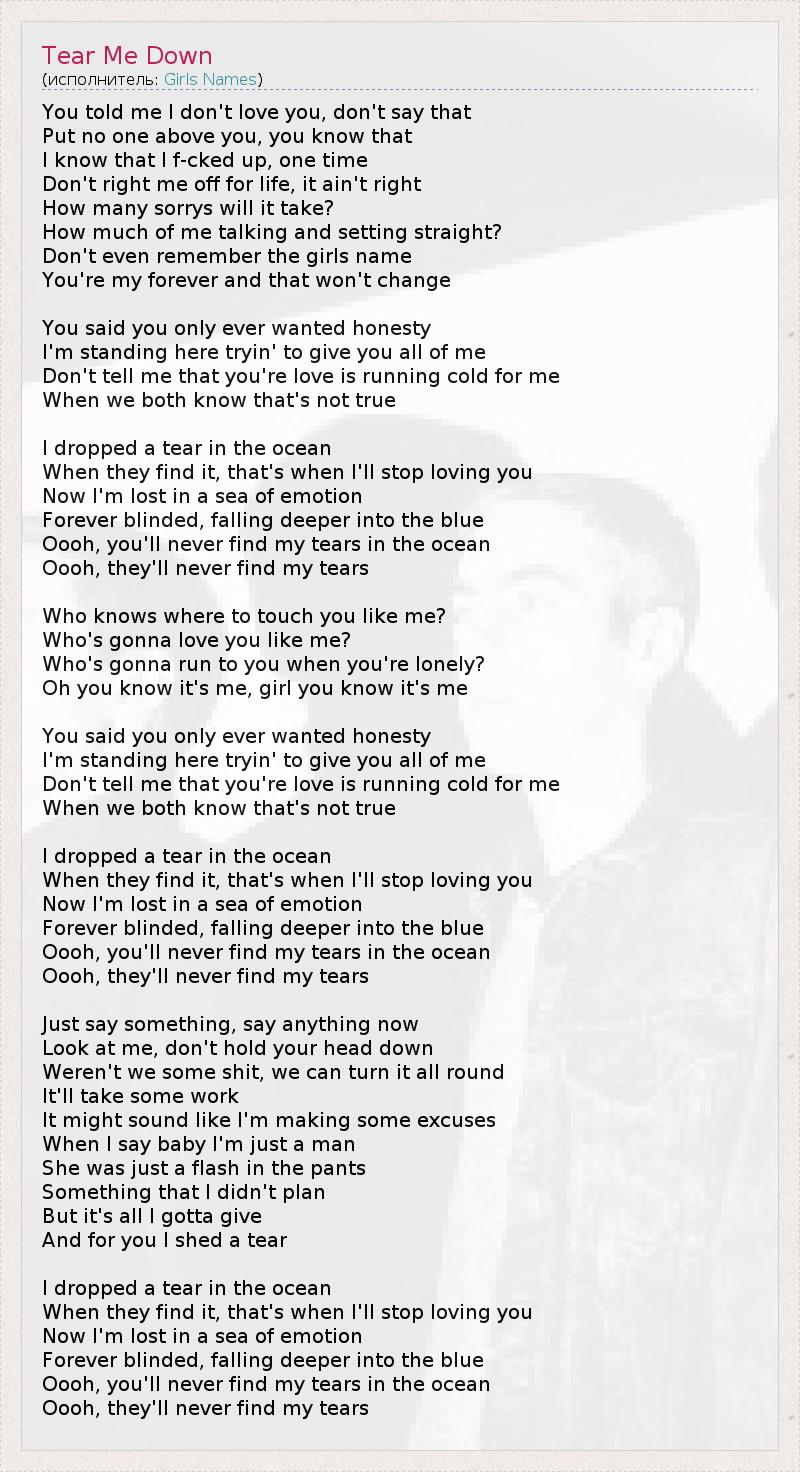 Ты сказала, что я не люблю тебя – не надо так, Ты для меня превыше всего и знаешь это. Да, я один раз ошибся, Но не вычёркивай меня из жизни, это неправильно. Сколько раз мне нужно извиниться? Сколько раз объясниться и как долго исправляться? Я даже не помню имени той девушки, Ты моя навеки, и это неизменно. Ты сказала, что всегда хотела лишь честности - И вот я стою перед тобой, изливая душу. Прошу, не говори, что твоя любовь ко мне охладевает, Ведь мы оба знаем, что это неправда. Я уронил слезу в океан И перестану любить тебя лишь тогда, когда её найдут. Я тону в океане чувств, И меня, ослеплённого, накрывают волны. Ооо, тебе не найти моих слёз в океане, Ооо, никому не найти моих слёз. Кто ещё знает, как прикасаться к тебе? Кто полюбит тебя так же, как я? Кто помчится к тебе, когда ты одинока? О, ты знаешь, только я, девочка, ты ведь знаешь, это буду я... Ты сказала, что всегда хотела лишь честности - И вот я стою перед тобой, изливая душу. Прошу, не говори, что твоя любовь ко мне охладевает, Ведь мы оба знаем, что это неправда. Я уронил слезу в океан И перестану любить тебя лишь тогда, когда её найдут. Я тону в океане чувств, И меня, ослеплённого, накрывают волны. Ооо, тебе не найти моих слёз в океане, Ооо, никому не найти моих слёз. Просто скажи что-нибудь, скажи что-нибудь, Взгляни на меня, не опускай голову. Да, нам было паршиво, но мы можем всё изменить, Пусть и придётся поработать. Может показаться, что я оправдываюсь, Говоря, что я всего лишь мужчина. Она была минутным помрачением, Я думал телом, а не головой, Но это всё, что я могу сказать, А ради тебя я пролил слезу... Я уронил слезу в океан И перестану любить тебя лишь тогда, когда её найдут. Я тону в океане чувств, И меня, ослеплённого, накрывают волны. Ооо, тебе не найти моих слёз в океане, Ооо, никому не найти моих слёз.