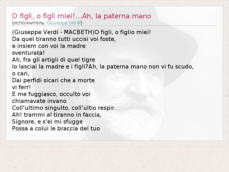 А как ты думаешь, о чем песня "O figli, o figli miei!...Ah, la paterna mano" ?