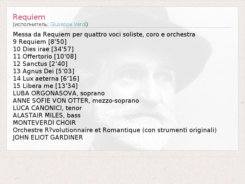 Messa da Requiem per quattro voci soliste, coro e orchestra 9 Requiem [8'50] 10 Dies irae [34'57] 11 Offertorio [10'08] 12 Sanctus [2'40] 13 Agnus Dei [5'03] 14 Lux aeterna [6'16] 15 Libera me [13'34] LUBA ORGONASOVA, soprano ANNE SOFIE VON OTTER, mezzo-soprano LUCA CANONICI, tenor ALASTAIR MILES, bass MONTEVERDI CHOIR Orchestre R?volutionnaire et Romantique (con strumenti originali) JOHN ELIOT GARDINER