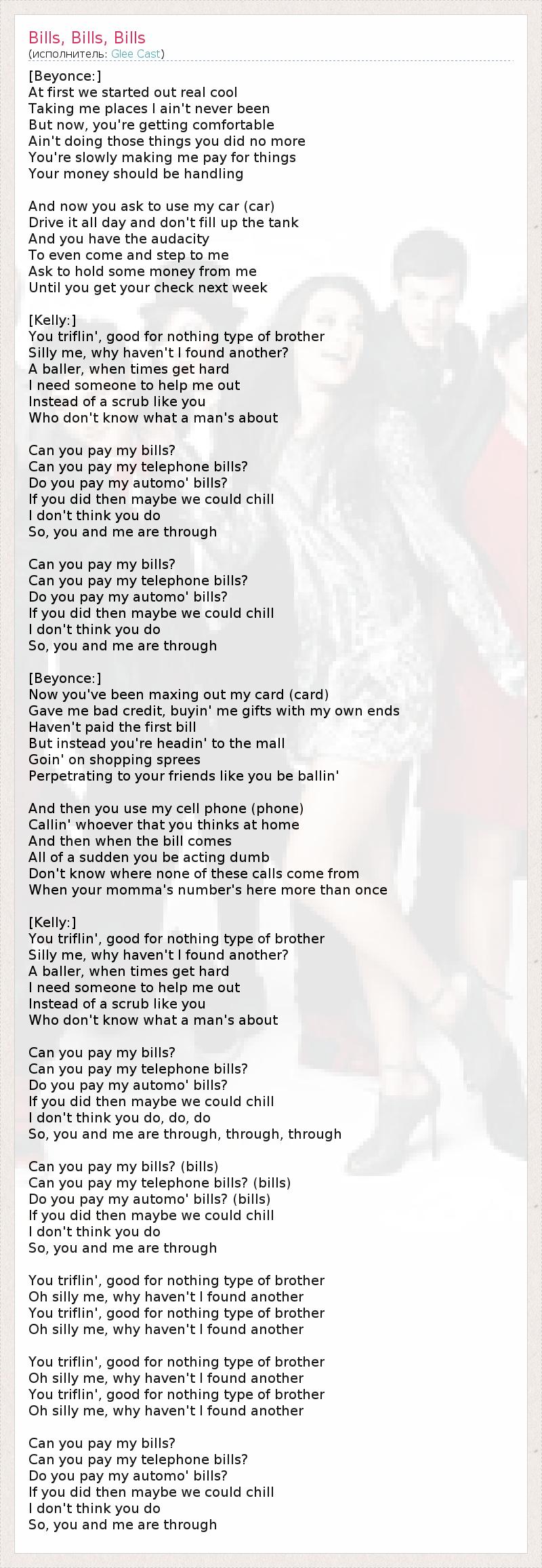 [Beyonce:] Сначала было все реально классно, Ты водил меня туда, где я раньше не была. Но сейчас ты хорошо устроился, Больше не делаешь то, что раньше. С каждым разом все больше заставляешь меня платить по счетам, Но твои деньги тоже должны расходоваться! А теперь ты просишь погонять мою машину (машину), Катаешься на ней целый день и не тратишься на бензин. И у тебя хватает наглости Прийти ко мне, Чтобы занять денег, Пока ты не заарканишь еще одну цыпочку на следующей неделе. [Kelly:] Ты занимаешься пустяками, ни на что не годный. Дурачишь меня, почему бы мне не найти другую? Когда нет денег, ты их клянчишь. Мне нужен надежный человек Вместо такого ничтожества, как ты! Кто не знает, чего хочет мужчина… Ты заплатишь за меня? Ты оплатишь мои телефонные счета? Ты заплатишь за автомобиль? Если сделаешь это, может у нас все будет хорошо. Я думаю, ты и не собирался. Так что мы с тобой расстаемся… Ты заплатишь за меня? Ты оплатишь мои телефонные счета? Ты заплатишь за автомобиль? Если сделаешь это, может у нас все будет хорошо. Я думаю, ты и не собирался. Так что мы с тобой расстаемся… [Beyonce:] Ты выпотрошил всю мою карточку (карточку). Сделал мне «плохой кредит», покупал мне подарки на мои же деньги. Не заплатил за первый счет, А наоборот пошел в супермаркет За покупками. Притворяешься перед друзьями, будто ты мачо. И когда звонишь по моему сотовому (сотовому). Звонишь всем на домашний. И когда приходят счета, Неожиданно прикидываешься бедной овечкой. Не знаешь, откуда взялись эти звонки, Хотя номер твоей мамочки повторяется несколько раз. [Kelly:] Ты занимаешься пустяками, ни на что не годный. Дурачишь меня, почему бы мне не найти другую? Когда нет денег, ты их клянчишь. Мне нужен надежный человек Вместо такого ничтожества, как ты! Кто не знает, чего хочет мужчина… Ты заплатишь за меня? Ты оплатишь мои телефонные счета? Ты заплатишь за автомобиль? Если сделаешь это, может у нас все будет хорошо. Я думаю, ты и не собирался. Так что мы с тобой расстаемся… Ты заплатишь за меня (счета)? Ты оплатишь мои телефонные счета? (счета) Ты заплатишь за автомобиль? (счета) Если сделаешь это, может у нас все будет хорошо. Я думаю, ты и не собирался. Так что мы с тобой расстаемся… Ты занимаешься пустяками, ни на что не годный. Дурачишь меня, почему бы мне не найти другую? Ты занимаешься пустяками, ни на что не годный. Дурачишь меня, почему бы мне не найти другую? Ты занимаешься пустяками, ни на что не годный. Дурачишь меня, почему бы мне не найти другую? Ты занимаешься пустяками, ни на что не годный. Дурачишь меня, почему бы мне не найти другую? Ты заплатишь за меня? Ты оплатишь мои телефонные счета? Ты заплатишь за автомобиль? Если сделаешь это, может у нас все будет хорошо. Я думаю, ты и не собирался. Так что мы с тобой расстаемся…
