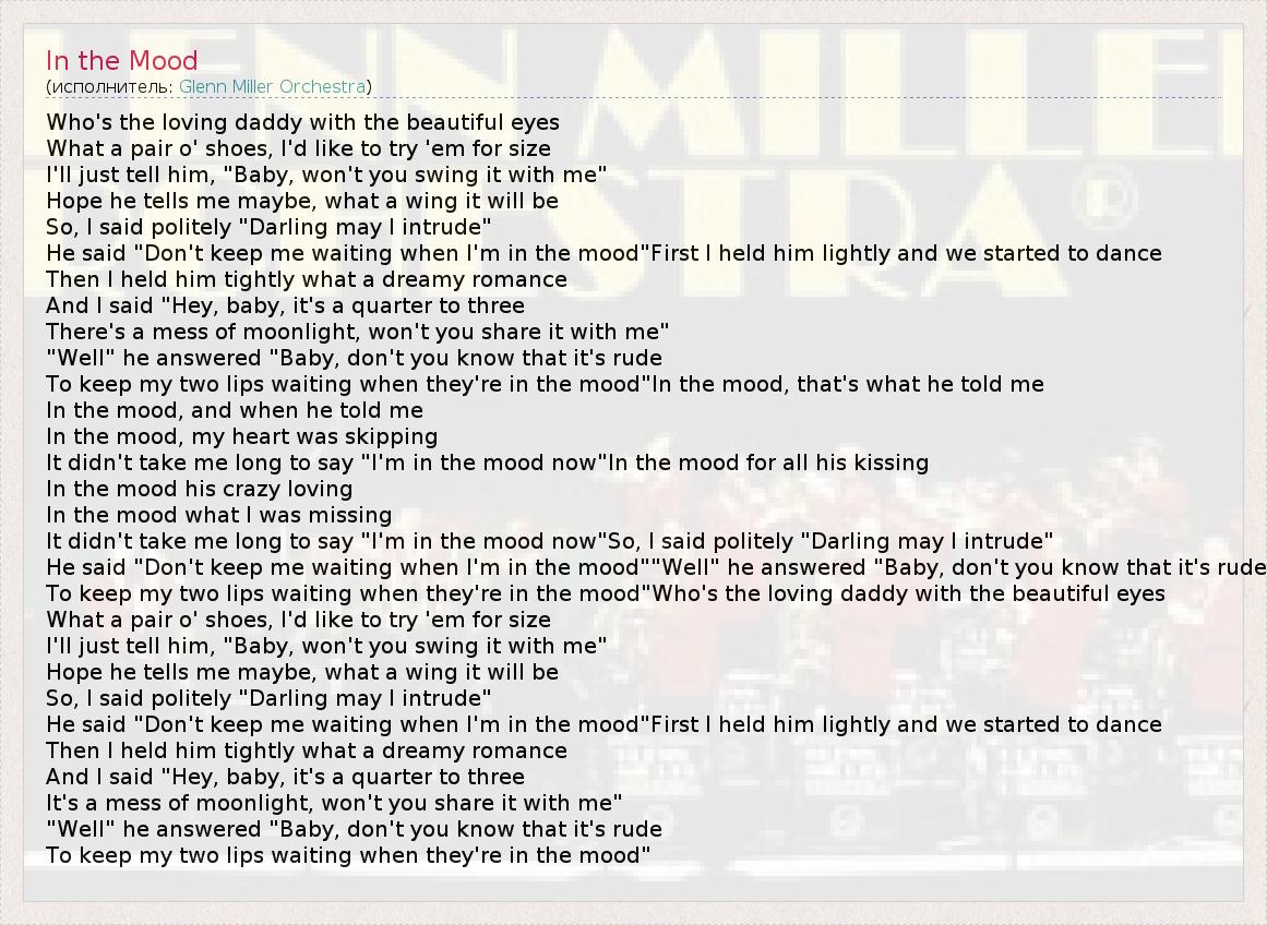 To keep my two lips waiting when they're in the mood"In the mood, that's what he told me