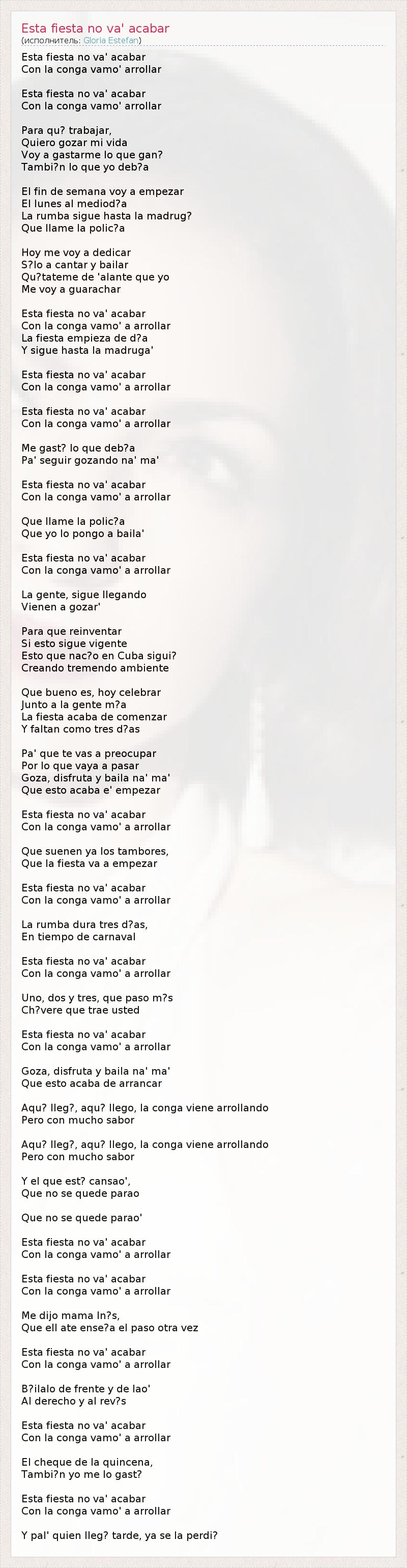Esta fiesta no va' acabar Con la conga vamo' arrollar Esta fiesta no va' acabar Con la conga vamo' arrollar Para qu? trabajar, Quiero gozar mi vida Voy a gastarme lo que gan? Tambi?n lo que yo deb?a El fin de semana voy a empezar El lunes al mediod?a La rumba sigue hasta la madrug? Que llame la polic?a Hoy me voy a dedicar S?lo a cantar y bailar Qu?tateme de 'alante que yo Me voy a guarachar Esta fiesta no va' acabar Con la conga vamo' a arrollar La fiesta empieza de d?a Y sigue hasta la madruga' Esta fiesta no va' acabar Con la conga vamo' a arrollar Esta fiesta no va' acabar Con la conga vamo' a arrollar Me gast? lo que deb?a Pa' seguir gozando na' ma' Esta fiesta no va' acabar Con la conga vamo' a arrollar Que llame la polic?a Que yo lo pongo a baila' Esta fiesta no va' acabar Con la conga vamo' a arrollar La gente, sigue llegando Vienen a gozar' Para que reinventar Si esto sigue vigente Esto que nac?o en Cuba sigui? Creando tremendo ambiente Que bueno es, hoy celebrar Junto a la gente m?a La fiesta acaba de comenzar Y faltan como tres d?as Pa' que te vas a preocupar Por lo que vaya a pasar Goza, disfruta y baila na' ma' Que esto acaba e' empezar Esta fiesta no va' acabar Con la conga vamo' a arrollar Que suenen ya los tambores, Que la fiesta va a empezar Esta fiesta no va' acabar Con la conga vamo' a arrollar La rumba dura tres d?as, En tiempo de carnaval Esta fiesta no va' acabar Con la conga vamo' a arrollar Uno, dos y tres, que paso m?s Ch?vere que trae usted Esta fiesta no va' acabar Con la conga vamo' a arrollar Goza, disfruta y baila na' ma' Que esto acaba de arrancar Aqu? lleg?, aqu? llego, la conga viene arrollando Pero con mucho sabor Aqu? lleg?, aqu? llego, la conga viene arrollando Pero con mucho sabor Y el que est? cansao', Que no se quede parao Que no se quede parao' Esta fiesta no va' acabar Con la conga vamo' a arrollar Esta fiesta no va' acabar Con la conga vamo' a arrollar Me dijo mama In?s, Que ell ate ense?a el paso otra vez Esta fiesta no va' acabar Con la conga vamo' a arrollar B?ilalo de frente y de lao' Al derecho y al rev?s Esta fiesta no va' acabar Con la conga vamo' a arrollar El cheque de la quincena, Tambi?n yo me lo gast? Esta fiesta no va' acabar Con la conga vamo' a arrollar Y pal' quien lleg? tarde, ya se la perdi?