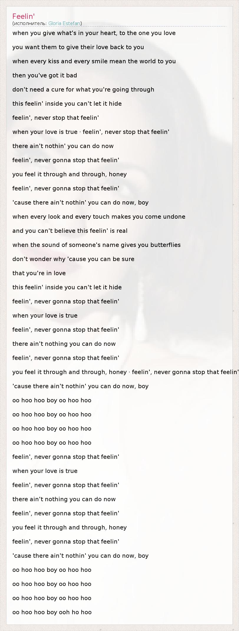 you feel it through and through, honey · feelin', never gonna stop that feelin'