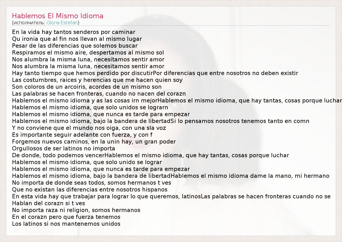 En la vida hay tantos senderos por caminar Qu ironia que al fin nos llevan al mismo lugar Pesar de las diferencias que solemos buscar Respiramos el mismo aire, despertamos al mismo sol Nos alumbra la misma luna, necesitamos sentir amor Nos alumbra la misma luna, necesitamos sentir amor Hay tanto tiempo que hemos perdido por discutirPor diferencias que entre nosotros no deben existir Las costumbres, raices y herencias que me hacen quien soy Son coloros de un arcoiris, acordes de un mismo son Las palabras se hacen fronteras, cuando no nacen del corazn Hablemos el mismo idioma y as las cosas irn mejorHablemos el mismo idioma, que hay tantas, cosas porque luchar Hablemos el mismo idioma, que solo unidos se lograrn Hablemos el mismo idioma, que nunca es tarde para empezar Hablemos el mismo idioma, bajo la bandera de libertadSi lo pensamos nosotros tenemos tanto en comn Y no conviene que el mundo nos oiga, con una sla voz Es importante seguir adelante con fuerza, y con f Forgemos nuevos caminos, en la unin hay, un gran poder Orgullosos de ser latinos no importa De donde, todo podemos vencerHablemos el mismo idioma, que hay tantas, cosas porque luchar Hablemos el mismo idioma, que solo unido se lograr Hablemos el mismo idioma, que nunca es tarde para empezar Hablemos el mismo idioma, bajo la bandera de libertadHablemos el mismo idioma dame la mano, mi hermano No importa de donde seas todos, somos hermanos t ves Que no existan las diferencias entre nosotros hispanos En esta vida hay que trabajar para lograr lo que queremos, latinosLas palabras se hacen fronteras cuando no se Hablan del corazn si t ves No importa raza ni religion, somos hermanos En el corazn pero que fuerza tenemos Los latinos si nos mantenemos unidos