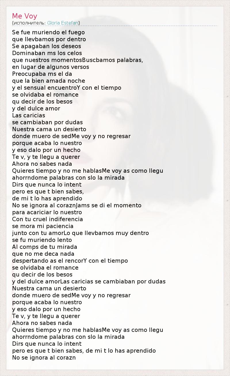 Se fue muriendo el fuego que llevbamos por dentro Se apagaban los deseos Dominaban ms los celos que nuestros momentosBuscbamos palabras, en lugar de algunos versos Preocupaba ms el da que la bien amada noche y el sensual encuentroY con el tiempo se olvidaba el romance qu decir de los besos y del dulce amor Las caricias se cambiaban por dudas Nuestra cama un desierto donde muero de sedMe voy y no regresar porque acaba lo nuestro y eso dalo por un hecho Te v, y te llegu a querer Ahora no sabes nada Quieres tiempo y no me hablasMe voy as como llegu ahorrndome palabras con slo la mirada Dirs que nunca lo intent pero es que t bien sabes, de mi t lo has aprendido No se ignora al coraznJams se di el momento para acariciar lo nuestro Con tu cruel indiferencia se mora mi paciencia junto con tu amorLo que llevbamos muy dentro se fu muriendo lento Al comps de tu mirada que no me deca nada despertando as el rencorY con el tiempo se olvidaba el romance qu decir de los besos y del dulce amorLas caricias se cambiaban por dudas Nuestra cama un desierto donde muero de sedMe voy y no regresar porque acaba lo nuestro y eso dalo por un hecho Te v, y te llegu a querer Ahora no sabes nada Quieres tiempo y no me hablasMe voy as como llegu ahorrndome palabras con slo la mirada Dirs que nunca lo intent pero es que t bien sabes, de mi t lo has aprendido No se ignora al corazn