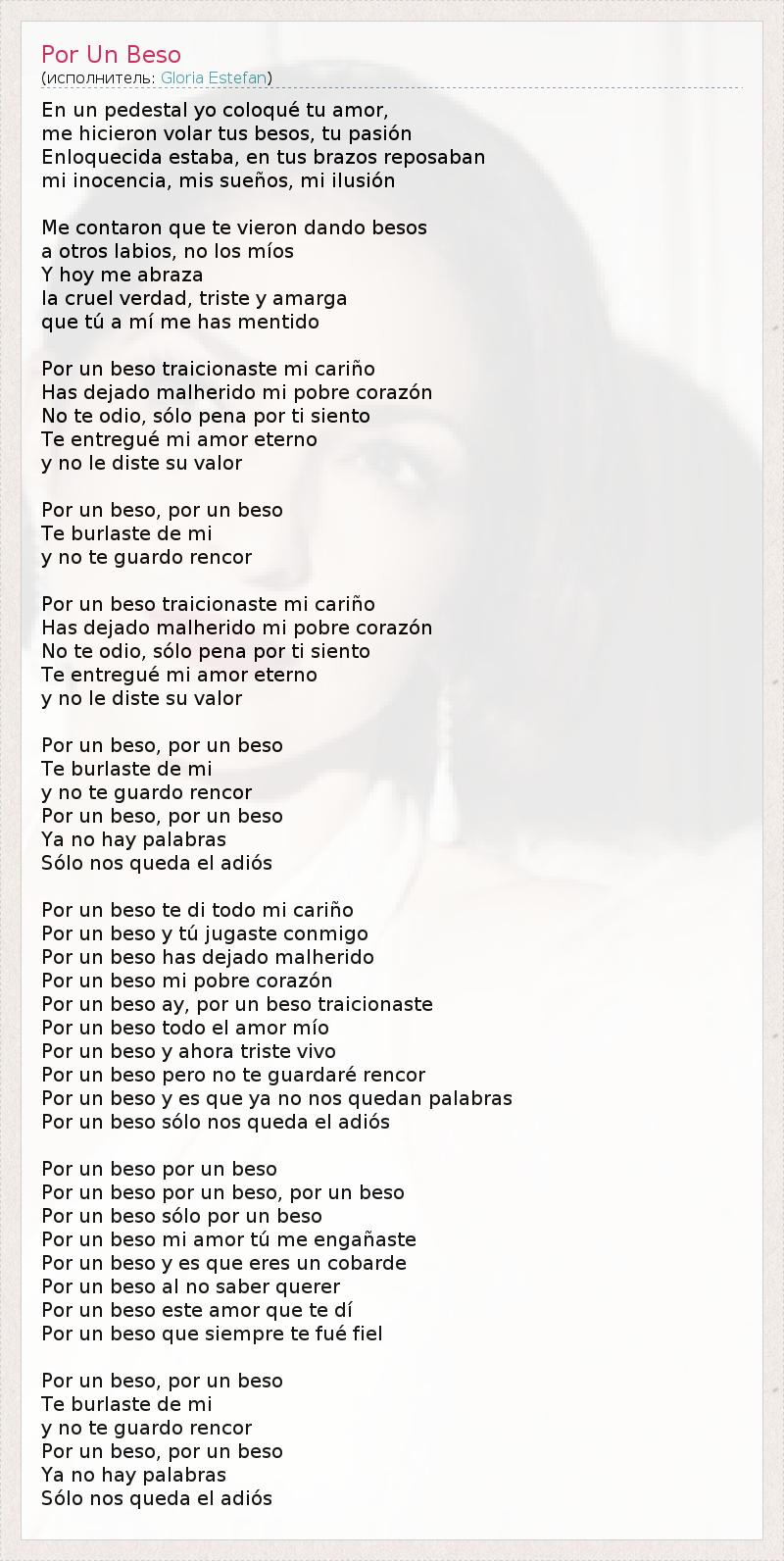 En ООН пьедестал йо coloqué Tu Amor , мне hicieron ладонной ЕП Besos , ту Pasión Enloquecida estaba , ан ЕП Brazos reposaban миль inocencia , неправильно sueños , миль Ilusion Меня contaron Que те vieron Dando Besos а Otros Labios , ни лос Mios Y хой меня abraza ла жестоким Verdad , Грустный у Амарга Que túmí меня есть mentido Por ООН Бесо traicionaste миль Cariño Имеет dejado malherido миль Pobre corazón Нет те Одио , соло Пена POR TI Siento Те entregué Mi Amor Eterno не у нет ле diste су доблесть Por ООН Бесо , POR ООН Бесо Те burlaste де миль не у не те GUARDO rencor Por ООН Бесо traicionaste миль Cariño Имеет dejado malherido миль Pobre corazón Нет те Одио , соло Пена POR TI Siento Те entregué Mi Amor Eterno не у нет ле diste су доблесть Por ООН Бесо , POR ООН Бесо Те burlaste де миль не у не те GUARDO rencor Por ООН Бесо , POR ООН Бесо Я. не сено Palabras Solo NOS -Каида эль Adiós Por ООН Бесо те ди TODO миль Cariño Por ООН Бесо у tú jugaste Conmigo Por ООН Бесо имеет dejado malherido Por ООН Бесо миль Pobre corazón Por ООН Бесо ау , POR ООН Бесо traicionaste Por ООН Бесо Todo эль Amor Mio Por ООН Бесо у Ahora Грустный естественных Por ООН Бесо перо не те guardaré rencor Por ООН Бесо у эс Que я не NOS quedan Palabras Por ООН Бесо Соло NOS -Каида эль Adiós Por ООН Бесо Por ООН Бесо Por ООН Бесо Por ООН Бесо POR ООН Бесо Por ООН Бесо Соло Por оон Beso Por ООН Бесо Mi Amor tú меня engañaste Por ООН Бесо у эс Que Eres ООН cobarde Por ООН Бесо аль нет сабля Querer Por ООН Бесо Эсте амор Que те ди Por ООН Бесо Que Siempre те ФРУ Fiel Por ООН Бесо , POR ООН Бесо Те burlaste де миль не у не те GUARDO rencor Por ООН Бесо , POR ООН Бесо Я. не сено Palabras Solo NOS -Каида эль Adiós