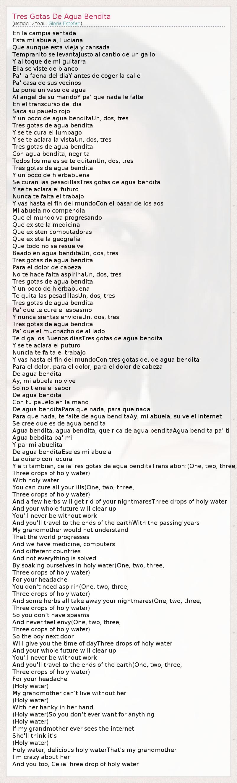 En la campia sentada Esta mi abuela, Luciana Que aunque esta vieja y cansada Tempranito se levantaJusto al cantio de un gallo Y al toque de mi guitarra Ella se viste de blanco Pa' la faena del diaY antes de coger la calle Pa' casa de sus vecinos Le pone un vaso de agua Al angel de su maridoY pa' que nada le falte En el transcurso del dia Saca su pauelo rojo Y un poco de agua benditaUn, dos, tres Tres gotas de agua bendita Y se te cura el lumbago Y se te aclara la vistaUn, dos, tres Tres gotas de agua bendita Con agua bendita, negrita Todos los males se te quitanUn, dos, tres Tres gotas de agua bendita Y un poco de hierbabuena Se curan las pesadillasTres gotas de agua bendita Y se te aclara el futuro Nunca te falta el trabajo Y vas hasta el fin del mundoCon el pasar de los aos Mi abuela no compendia Que el mundo va progresando Que existe la medicina Que existen computadoras Que existe la geografia Que todo no se resuelve Baado en agua benditaUn, dos, tres Tres gotas de agua bendita Para el dolor de cabeza No te hace falta aspirinaUn, dos, tres Tres gotas de agua bendita Y un poco de hierbabuena Te quita las pesadillasUn, dos, tres Tres gotas de agua bendita Pa' que te cure el espasmo Y nunca sientas envidiaUn, dos, tres Tres gotas de agua bendita Pa' que el muchacho de al lado Te diga los Buenos diasTres gotas de agua bendita Y se te aclara el puturo Nuncia te falta el trabajo Y vas hasta el fin del mundoCon tres gotas de, de agua bendita Para el dolor, para el dolor, para el dolor de cabeza De agua bendita Ay, mi abuela no vive So no tiene el sabor De agua bendita Con tu pauelo en la mano De agua benditaPara que nada, para que nada Para que nada, te falte de agua benditaAy, mi abuela, su ve el internet Se cree que es de agua bendita Agua bendita, agua bendita, que rica de agua benditaAgua bendita pa' ti Agua bebdita pa' mi Y pa' mi abuelita De agua benditaEse es mi abuela La quiero con locura Y a ti tambien, celiaTres gotas de agua benditaTranslation:(One, two, three, Three drops of holy water) With holy water You can cure all your ills(One, two, three, Three drops of holy water) And a few herbs will get rid of your nightmaresThree drops of holy water And your whole future will clear up You'll never be without work And you'll travel to the ends of the earthWith the passing years My grandmother would not understand That the world progresses And we have medicine, computers And different countries And not everything is solved By soaking ourselves in holy water(One, two, three, Three drops of holy water) For your headache You don't need aspirin(One, two, three, Three drops of holy water) And some herbs all take away your nightmares(One, two, three, Three drops of holy water) So you don't have spasms And never feel envy(One, two, three, Three drops of holy water) So the boy next door Will give you the time of dayThree drops of holy water And your whole future will clear up You'll never be without work And you'll travel to the ends of the earth(One, two, three, Three drops of holy water) For your headache (Holy water) My grandmother can't live without her (Holy water) With her hanky in her hand (Holy water)So you don't ever want for anything (Holy water) If my grandmother ever sees the internet She'll think it's (Holy water) Holy water, delicious holy waterThat's my grandmother I'm crazy about her And you too, CeliaThree drop of holy water