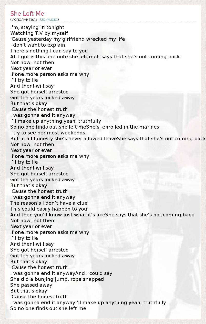 I'm, staying in tonight Watching T.V by myself 'Cause yesterday my girlfriend wrecked my life I don't want to explain There's nothing I can say to you All I got is this one note she left meIt says that she's not coming back Not now, not then Next year or ever If one more person asks me why I'll try to lie And thenI will say She got herself arrested Got ten years locked away But that's okay 'Cause the honest truth I was gonna end it anyway I'll make up anything yeah, truthfully So no one finds out she left meShe's, enrolled in the marines I try to see her most weekends But in all honesty she's never allowed leaveShe says that she's not coming back Not now, not then Next year or ever If one more person asks me why I'll try to lie And thenI will say She got herself arrested Got ten years locked away But that's okay 'Cause the honest truth I was gonna end it anyway The reason's I don't have a clue This could easily happen to you And then you'll know just what it's likeShe says that she's not coming back Not now, not then Next year or ever If one more person asks me why I'll try to lie And thenI will say She got herself arrested Got ten years locked away But that's okay 'Cause the honest truth I was gonna end it anywayAnd I could say She did a bunjing jump, rope snapped She passed away But that's okay 'Cause the honest truth I was gonna end it anywayI'll make up anything yeah, truthfully So no one finds out she left me