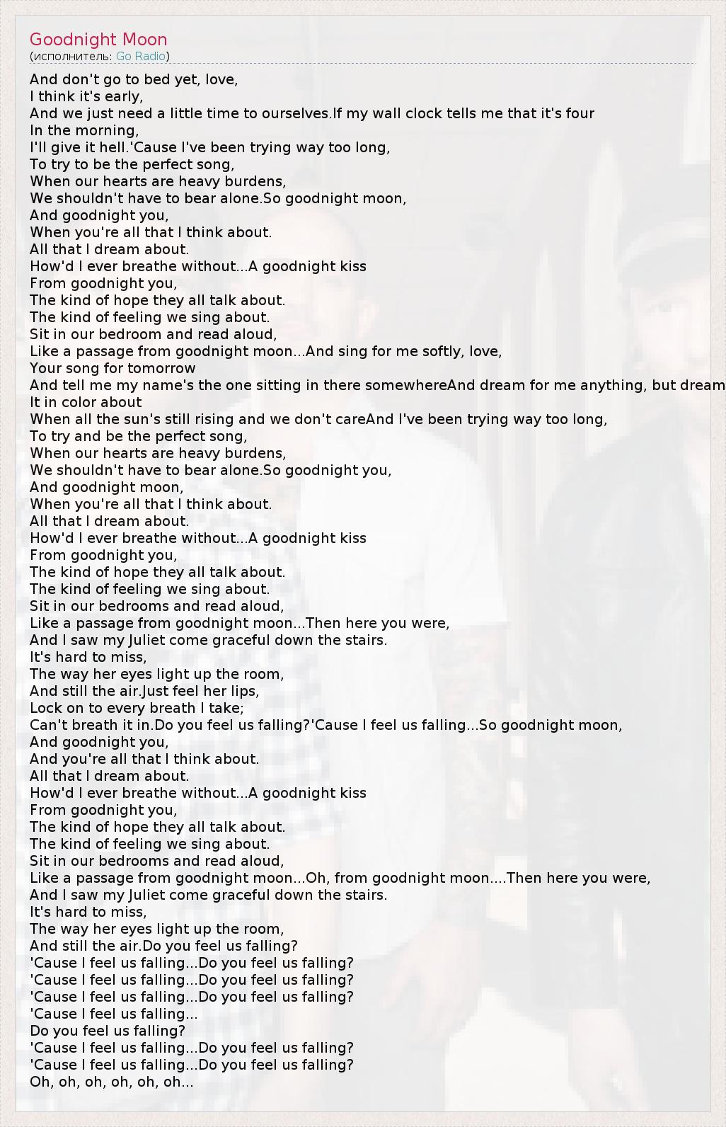 Can't breath it in.Do you feel us falling?'Cause I feel us falling...So goodnight moon,