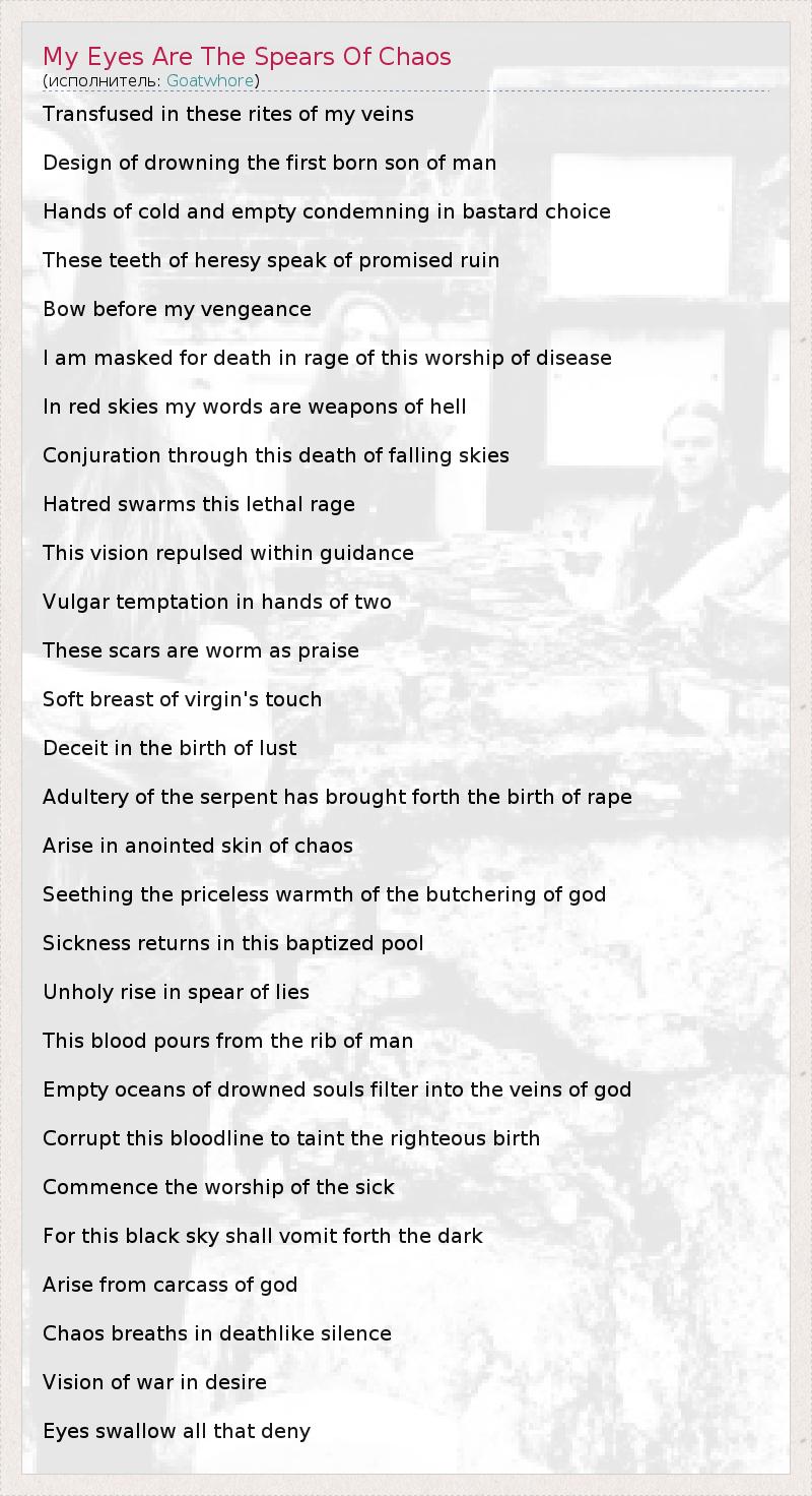 А как ты думаешь, о чем песня "My Eyes Are The Spears Of Chaos" ?