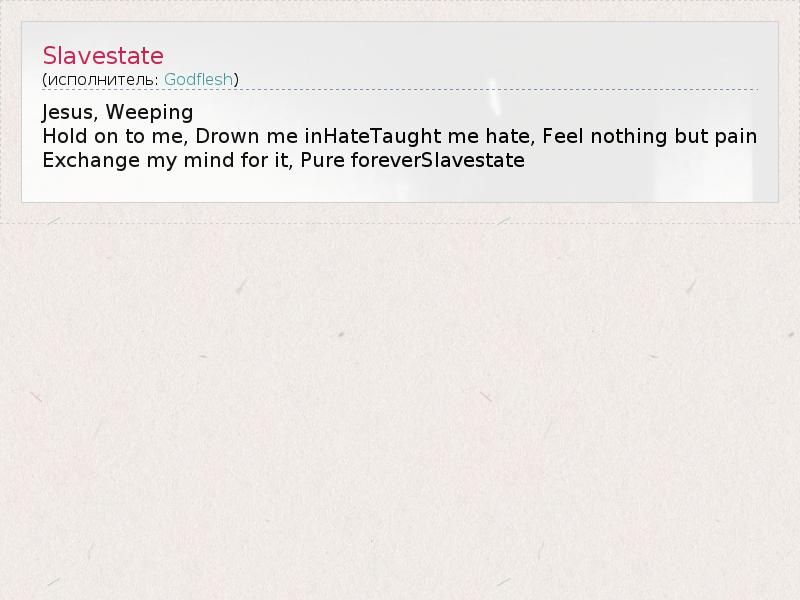 Jesus, Weeping Hold on to me, Drown me inHateTaught me hate, Feel nothing but pain Exchange my mind for it, Pure foreverSlavestate