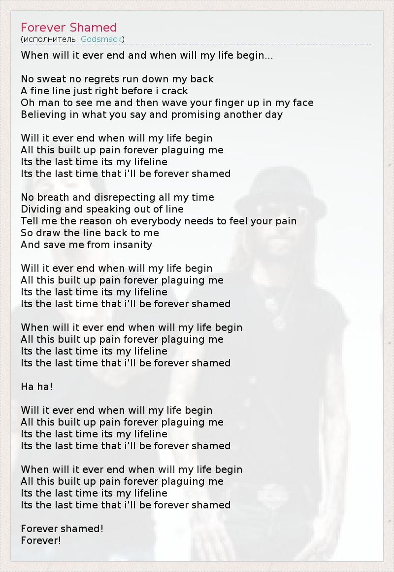 When will it ever end and when will my life begin... No sweat no regrets run down my back A fine line just right before i crack Oh man to see me and then wave your finger up in my face Believing in what you say and promising another day Will it ever end when will my life begin All this built up pain forever plaguing me Its the last time its my lifeline Its the last time that i'll be forever shamed No breath and disrepecting all my time Dividing and speaking out of line Tell me the reason oh everybody needs to feel your pain So draw the line back to me And save me from insanity Will it ever end when will my life begin All this built up pain forever plaguing me Its the last time its my lifeline Its the last time that i'll be forever shamed When will it ever end when will my life begin All this built up pain forever plaguing me Its the last time its my lifeline Its the last time that i'll be forever shamed Ha ha! Will it ever end when will my life begin All this built up pain forever plaguing me Its the last time its my lifeline Its the last time that i'll be forever shamed When will it ever end when will my life begin All this built up pain forever plaguing me Its the last time its my lifeline Its the last time that i'll be forever shamed Forever shamed! Forever!