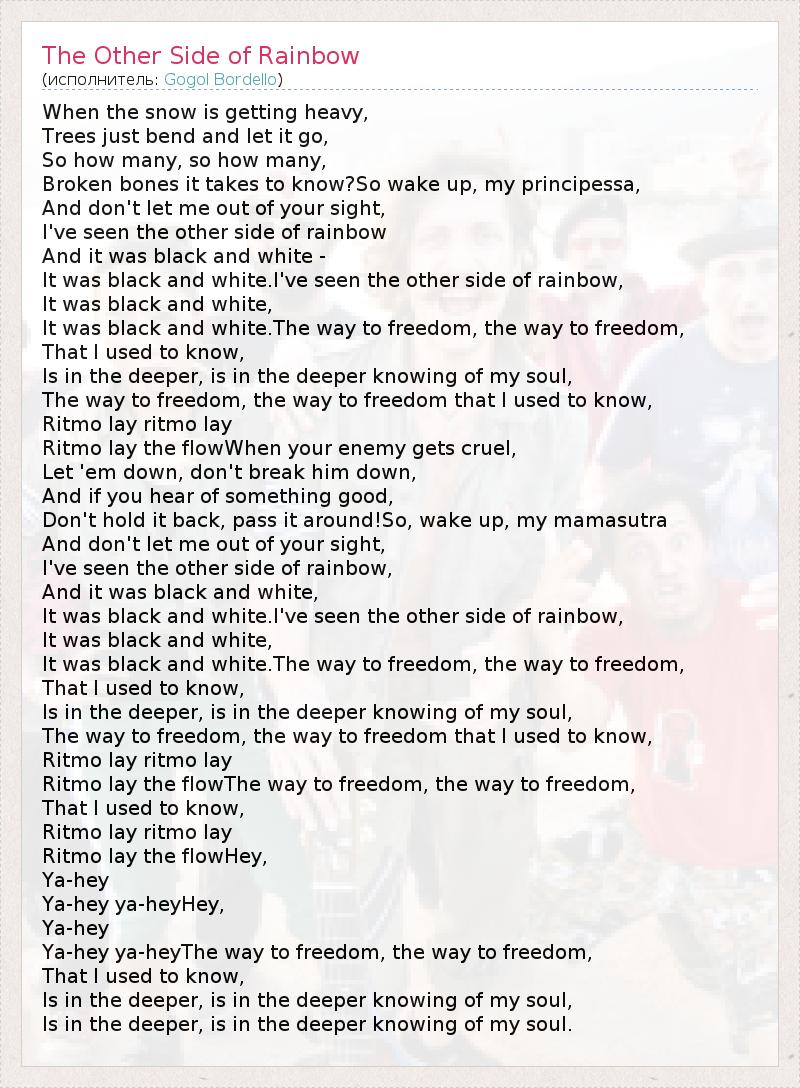 When the snow is getting heavy, Trees just bend and let it go, So how many, so how many, Broken bones it takes to know?So wake up, my principessa, And don't let me out of your sight, I've seen the other side of rainbow And it was black and white - It was black and white.I've seen the other side of rainbow, It was black and white, It was black and white.The way to freedom, the way to freedom, That I used to know, Is in the deeper, is in the deeper knowing of my soul, The way to freedom, the way to freedom that I used to know, Ritmo lay ritmo lay Ritmo lay the flowWhen your enemy gets cruel, Let 'em down, don't break him down, And if you hear of something good, Don't hold it back, pass it around!So, wake up, my mamasutra And don't let me out of your sight, I've seen the other side of rainbow, And it was black and white, It was black and white.I've seen the other side of rainbow, It was black and white, It was black and white.The way to freedom, the way to freedom, That I used to know, Is in the deeper, is in the deeper knowing of my soul, The way to freedom, the way to freedom that I used to know, Ritmo lay ritmo lay Ritmo lay the flowThe way to freedom, the way to freedom, That I used to know, Ritmo lay ritmo lay Ritmo lay the flowHey, Ya-hey Ya-hey ya-heyHey, Ya-hey Ya-hey ya-heyThe way to freedom, the way to freedom, That I used to know, Is in the deeper, is in the deeper knowing of my soul, Is in the deeper, is in the deeper knowing of my soul.