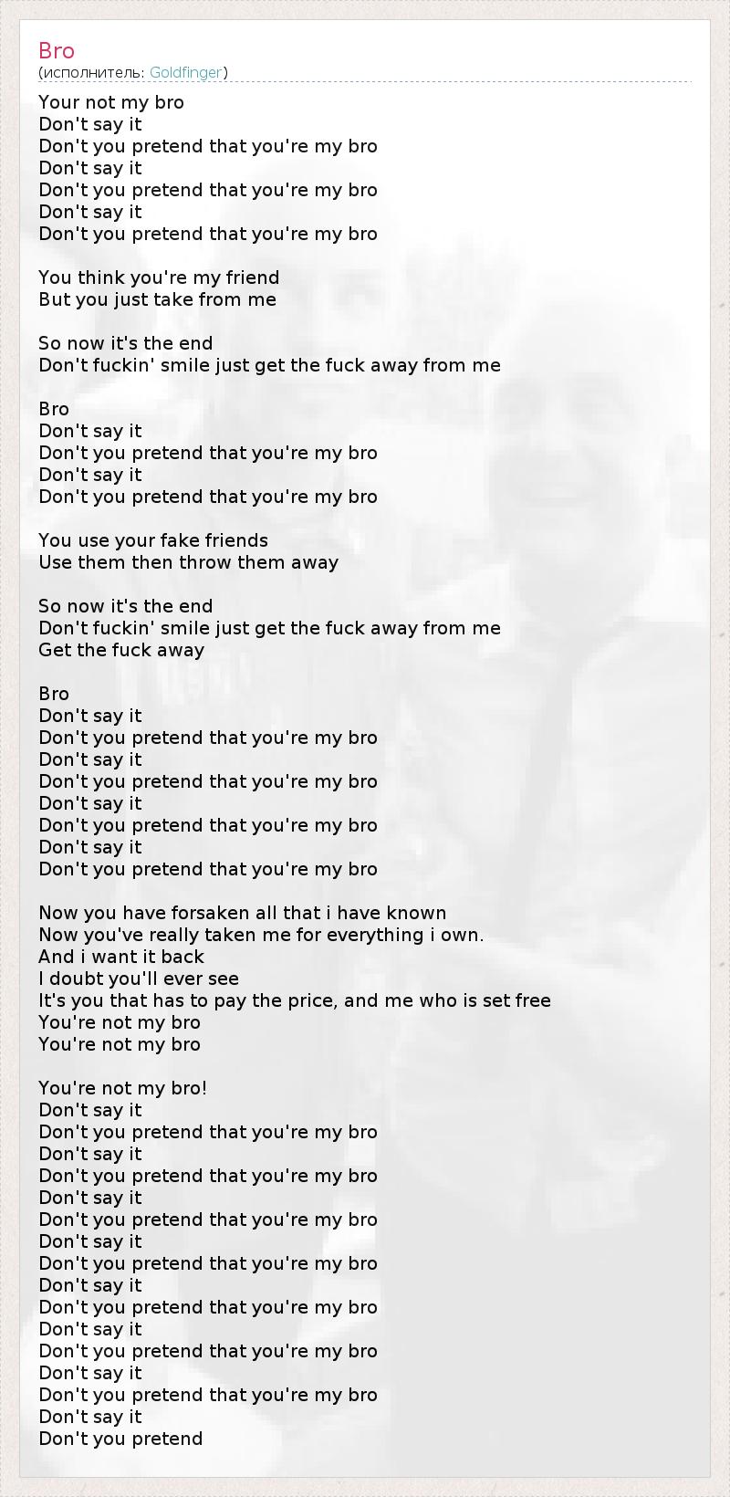 Your not my bro Don't say it Don't you pretend that you're my bro Don't say it Don't you pretend that you're my bro Don't say it Don't you pretend that you're my bro You think you're my friend But you just take from me So now it's the end Don't fuckin' smile just get the fuck away from me Bro Don't say it Don't you pretend that you're my bro Don't say it Don't you pretend that you're my bro You use your fake friends Use them then throw them away So now it's the end Don't fuckin' smile just get the fuck away from me Get the fuck away Bro Don't say it Don't you pretend that you're my bro Don't say it Don't you pretend that you're my bro Don't say it Don't you pretend that you're my bro Don't say it Don't you pretend that you're my bro Now you have forsaken all that i have known Now you've really taken me for everything i own. And i want it back I doubt you'll ever see It's you that has to pay the price, and me who is set free You're not my bro You're not my bro You're not my bro! Don't say it Don't you pretend that you're my bro Don't say it Don't you pretend that you're my bro Don't say it Don't you pretend that you're my bro Don't say it Don't you pretend that you're my bro Don't say it Don't you pretend that you're my bro Don't say it Don't you pretend that you're my bro Don't say it Don't you pretend that you're my bro Don't say it Don't you pretend