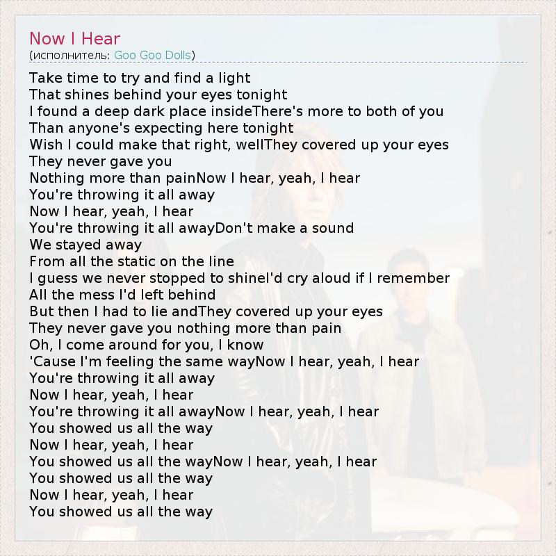Take time to try and find a light That shines behind your eyes tonight I found a deep dark place insideThere's more to both of you Than anyone's expecting here tonight Wish I could make that right, wellThey covered up your eyes They never gave you Nothing more than painNow I hear, yeah, I hear You're throwing it all away Now I hear, yeah, I hear You're throwing it all awayDon't make a sound We stayed away From all the static on the line I guess we never stopped to shineI'd cry aloud if I remember All the mess I'd left behind But then I had to lie andThey covered up your eyes They never gave you nothing more than pain Oh, I come around for you, I know 'Cause I'm feeling the same wayNow I hear, yeah, I hear You're throwing it all away Now I hear, yeah, I hear You're throwing it all awayNow I hear, yeah, I hear You showed us all the way Now I hear, yeah, I hear You showed us all the wayNow I hear, yeah, I hear You showed us all the way Now I hear, yeah, I hear You showed us all the way