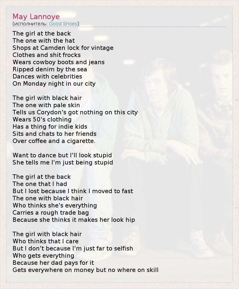 The girl at the back The one with the hat Shops at Camden lock for vintage Clothes and shit frocks Wears cowboy boots and jeans Ripped denim by the sea Dances with celebrities On Monday night in our city The girl with black hair The one with pale skin Tells us Corydon's got nothing on this city Wears 50's clothing Has a thing for indie kids Sits and chats to her friends Over coffee and a cigarette. Want to dance but I'll look stupid She tells me I'm just being stupid The girl at the back The one that I had But I lost because I think I moved to fast The one with black hair Who thinks she's everything Carries a rough trade bag Because she thinks it makes her look hip The girl with black hair Who thinks that I care But I don't because I'm just far to selfish Who gets everything Because her dad pays for it Gets everywhere on money but no where on skill