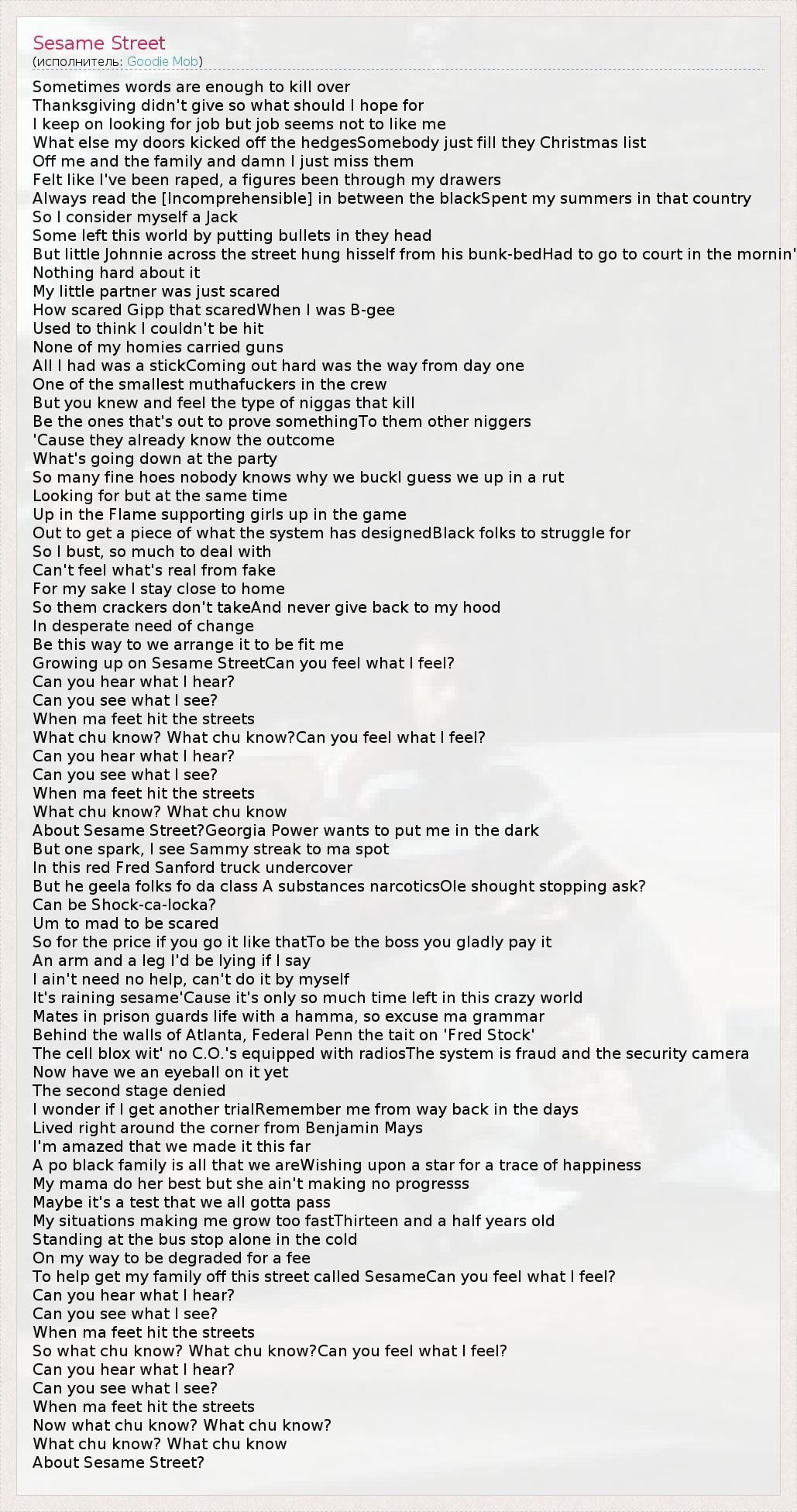 Это интересно:Goodie Mob - рэпперы из Атланты, почитаемы, как одна из наиболее “правильных” групп Южной сцены, своим появлением, в 1995 году, открывшая путь в хип-хоп многим южным бандам.В состав группы вошли, рэпперы Cee-Lo, Khujo, T-Mo и Big Gipp.Дебютный альбом "Soul Food", выпущенный в 1995, является одним из самых ранних Южных альбомов, появившихся на главном лэйбле и на ряду с дебютом рэп группы OutKast по существу... продолжение