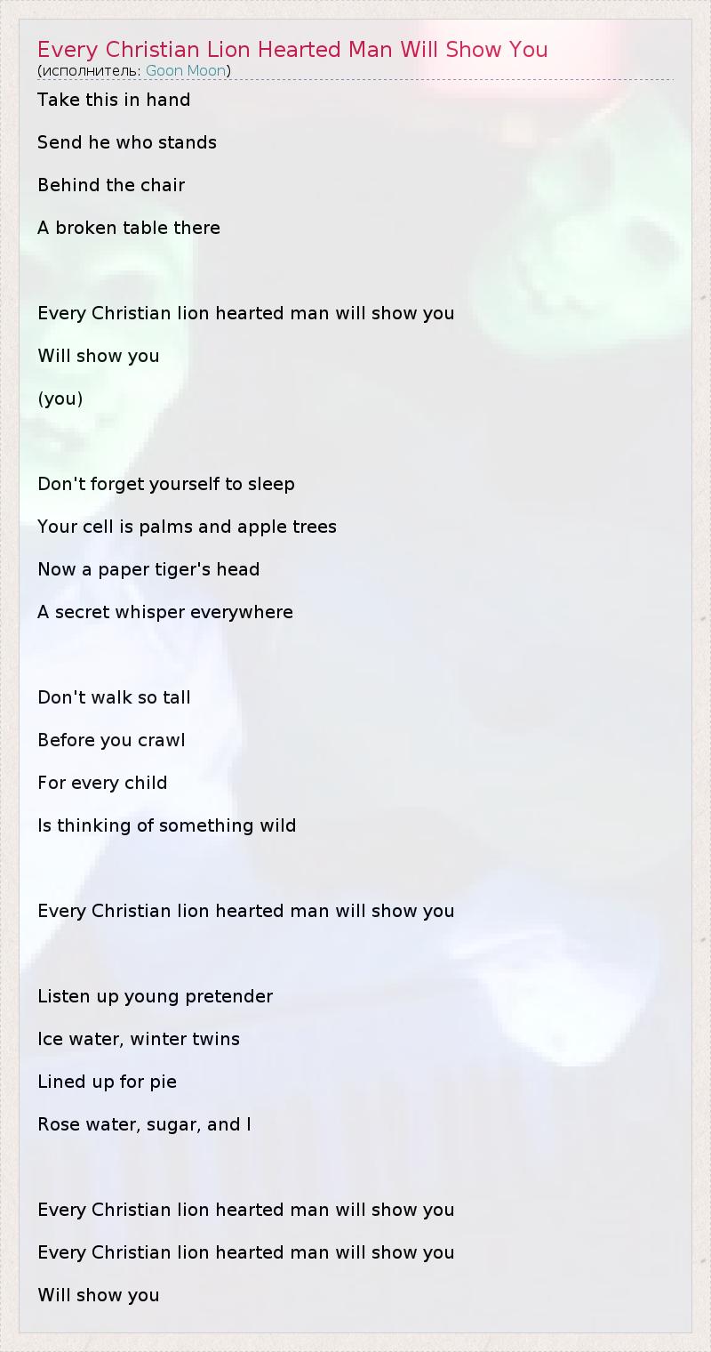 А как ты думаешь, о чем песня "Every Christian Lion Hearted Man Will Show You" ?