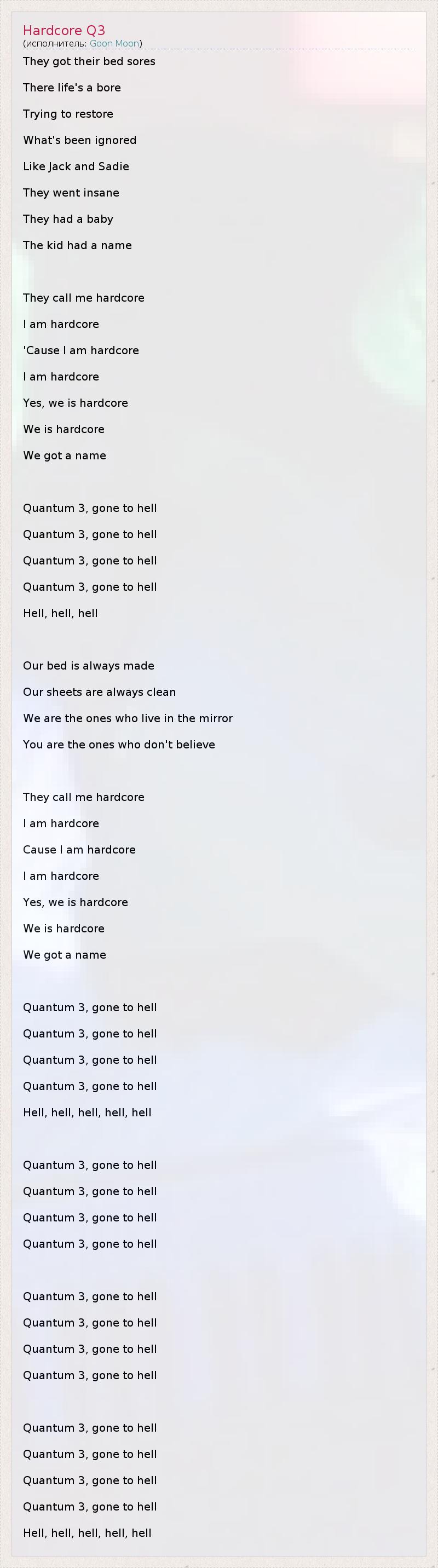 They got their bed sores There life's a bore Trying to restore What's been ignored Like Jack and Sadie They went insane They had a baby The kid had a name They call me hardcore I am hardcore 'Cause I am hardcore I am hardcore Yes, we is hardcore We is hardcore We got a name Quantum 3, gone to hell Quantum 3, gone to hell Quantum 3, gone to hell Quantum 3, gone to hell Hell, hell, hell Our bed is always made Our sheets are always clean We are the ones who live in the mirror You are the ones who don't believe They call me hardcore I am hardcore Cause I am hardcore I am hardcore Yes, we is hardcore We is hardcore We got a name Quantum 3, gone to hell Quantum 3, gone to hell Quantum 3, gone to hell Quantum 3, gone to hell Hell, hell, hell, hell, hell Quantum 3, gone to hell Quantum 3, gone to hell Quantum 3, gone to hell Quantum 3, gone to hell Quantum 3, gone to hell Quantum 3, gone to hell Quantum 3, gone to hell Quantum 3, gone to hell Quantum 3, gone to hell Quantum 3, gone to hell Quantum 3, gone to hell Quantum 3, gone to hell Hell, hell, hell, hell, hell