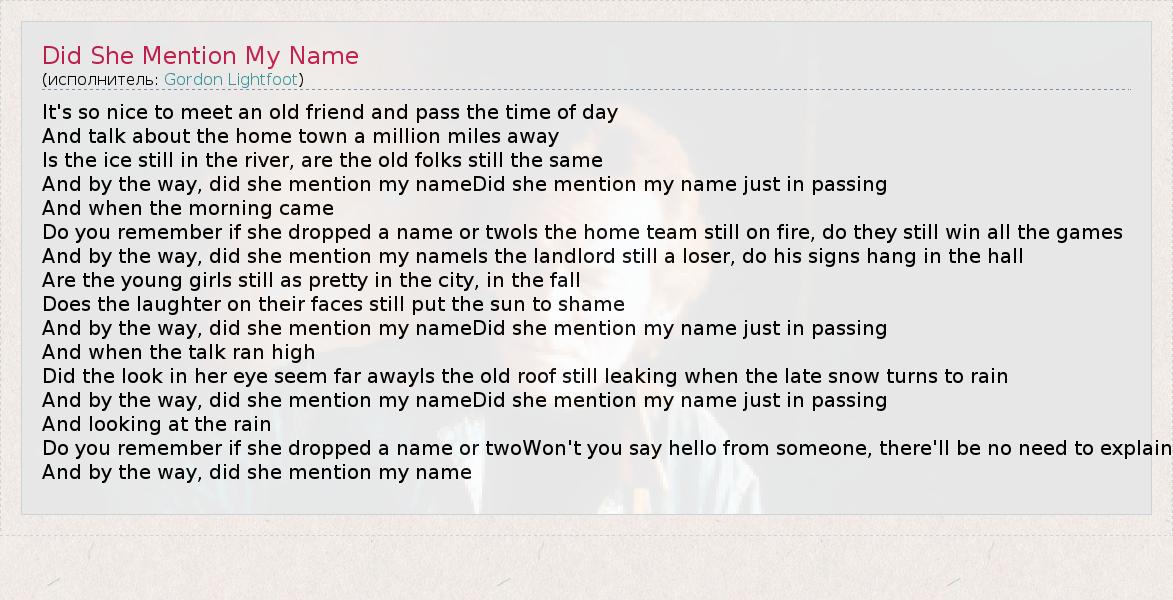 It's so nice to meet an old friend and pass the time of day And talk about the home town a million miles away Is the ice still in the river, are the old folks still the same And by the way, did she mention my nameDid she mention my name just in passing And when the morning came Do you remember if she dropped a name or twoIs the home team still on fire, do they still win all the games And by the way, did she mention my nameIs the landlord still a loser, do his signs hang in the hall Are the young girls still as pretty in the city, in the fall Does the laughter on their faces still put the sun to shame And by the way, did she mention my nameDid she mention my name just in passing And when the talk ran high Did the look in her eye seem far awayIs the old roof still leaking when the late snow turns to rain And by the way, did she mention my nameDid she mention my name just in passing And looking at the rain Do you remember if she dropped a name or twoWon't you say hello from someone, there'll be no need to explain And by the way, did she mention my name