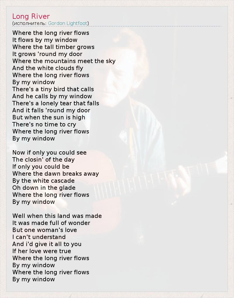 Where the long river flows It flows by my window Where the tall timber grows It grows 'round my door Where the mountains meet the sky And the white clouds fly Where the long river flows By my window There's a tiny bird that calls And he calls by my window There's a lonely tear that falls And it falls 'round my door But when the sun is high There's no time to cry Where the long river flows By my window Now if only you could see The closin' of the day If only you could be Where the dawn breaks away By the white cascade Oh down in the glade Where the long river flows By my window Well when this land was made It was made full of wonder But one woman's love I can't understand And i'd give it all to you If her love were true Where the long river flows By my window Where the long river flows By my window