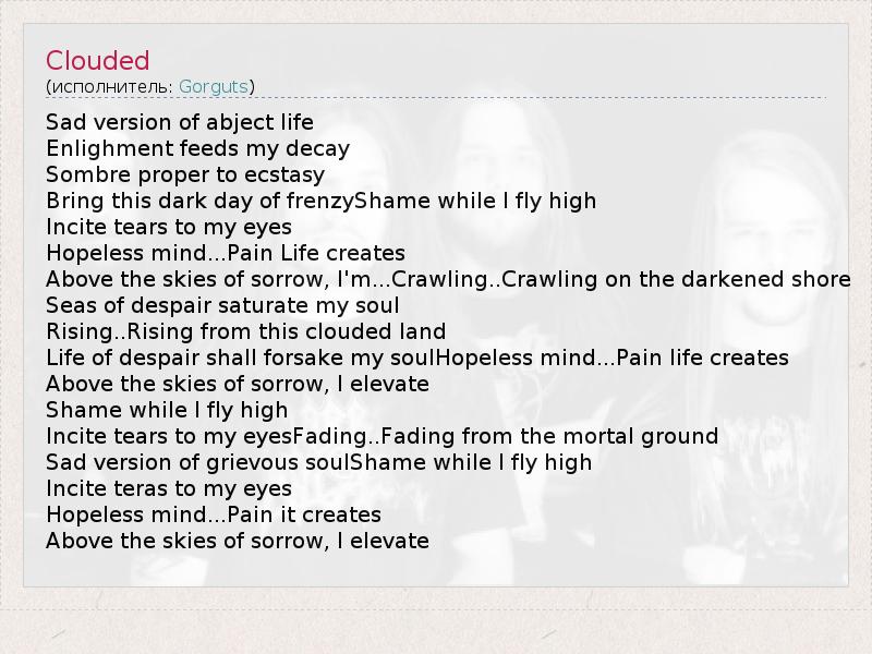 Sad version of abject life Enlighment feeds my decay Sombre proper to ecstasy Bring this dark day of frenzyShame while I fly high Incite tears to my eyes Hopeless mind...Pain Life creates Above the skies of sorrow, I'm...Crawling..Crawling on the darkened shore Seas of despair saturate my soul Rising..Rising from this clouded land Life of despair shall forsake my soulHopeless mind...Pain life creates Above the skies of sorrow, I elevate Shame while I fly high Incite tears to my eyesFading..Fading from the mortal ground Sad version of grievous soulShame while I fly high Incite teras to my eyes Hopeless mind...Pain it creates Above the skies of sorrow, I elevate