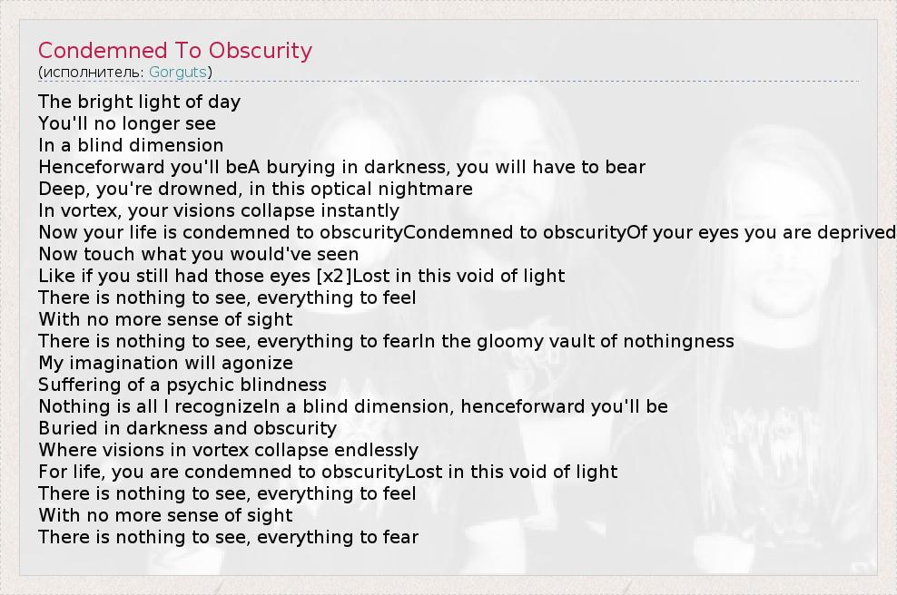 Now your life is condemned to obscurityCondemned to obscurityOf your eyes you are deprived