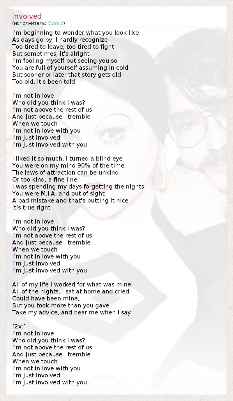 I'm beginning to wonder what you look like As days go by, I hardly recognize Too tired to leave, too tired to fight But sometimes, it's alright I'm fooling myself but seeing you so You are full of yourself assuming in cold But sooner or later that story gets old Too old, it's been told I'm not in love Who did you think I was? I'm not above the rest of us And just because I tremble When we touch I'm not in love with you I'm just involved I'm just involved with you I liked it so much, I turned a blind eye You were on my mind 90% of the time The laws of attraction can be unkind Or too kind, a fine line I was spending my days forgetting the nights You were M.I.A. and out of sight A bad mistake and that's putting it nice It's true right I'm not in love Who did you think I was? I'm not above the rest of us And just because I tremble When we touch I'm not in love with you I'm just involved I'm just involved with you All of my life I worked for what was mine All of the nights, I sat at home and cried Could have been mine, But you took more than you gave Take my advice, and hear me when I say [2x:] I'm not in love Who did you think I was? I'm not above the rest of us And just because I tremble When we touch I'm not in love with you I'm just involved I'm just involved with you