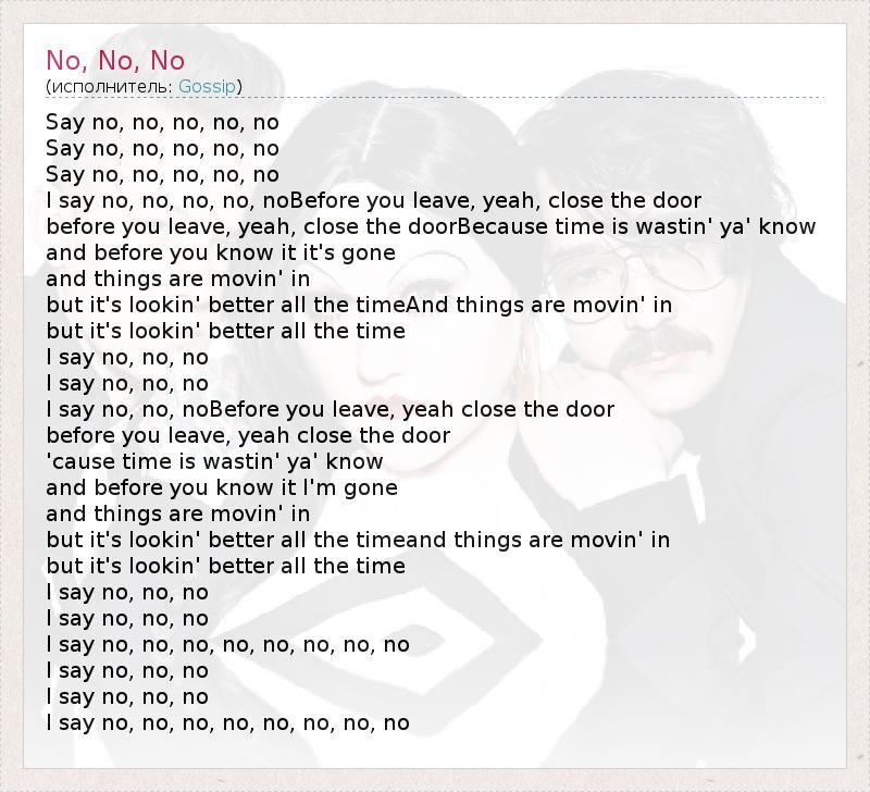 Say no, no, no, no, no Say no, no, no, no, no Say no, no, no, no, no I say no, no, no, no, noBefore you leave, yeah, close the door before you leave, yeah, close the doorBecause time is wastin' ya' know and before you know it it's gone and things are movin' in but it's lookin' better all the timeAnd things are movin' in but it's lookin' better all the time I say no, no, no I say no, no, no I say no, no, noBefore you leave, yeah close the door before you leave, yeah close the door 'cause time is wastin' ya' know and before you know it I'm gone and things are movin' in but it's lookin' better all the timeand things are movin' in but it's lookin' better all the time I say no, no, no I say no, no, no I say no, no, no, no, no, no, no, no I say no, no, no I say no, no, no I say no, no, no, no, no, no, no, no