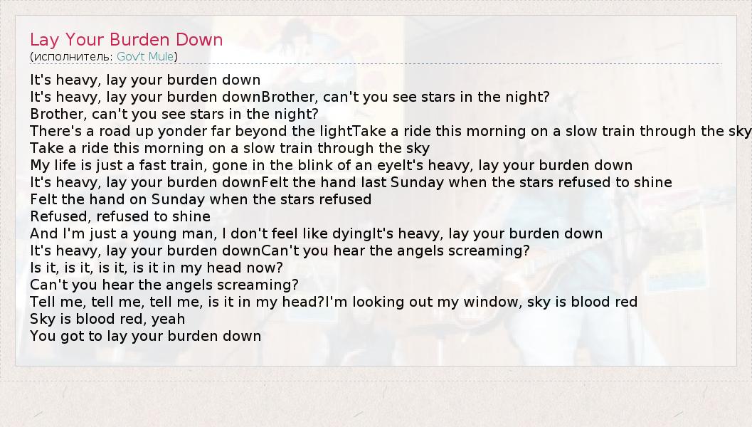 А как ты думаешь, о чем песня "Lay Your Burden Down" ?