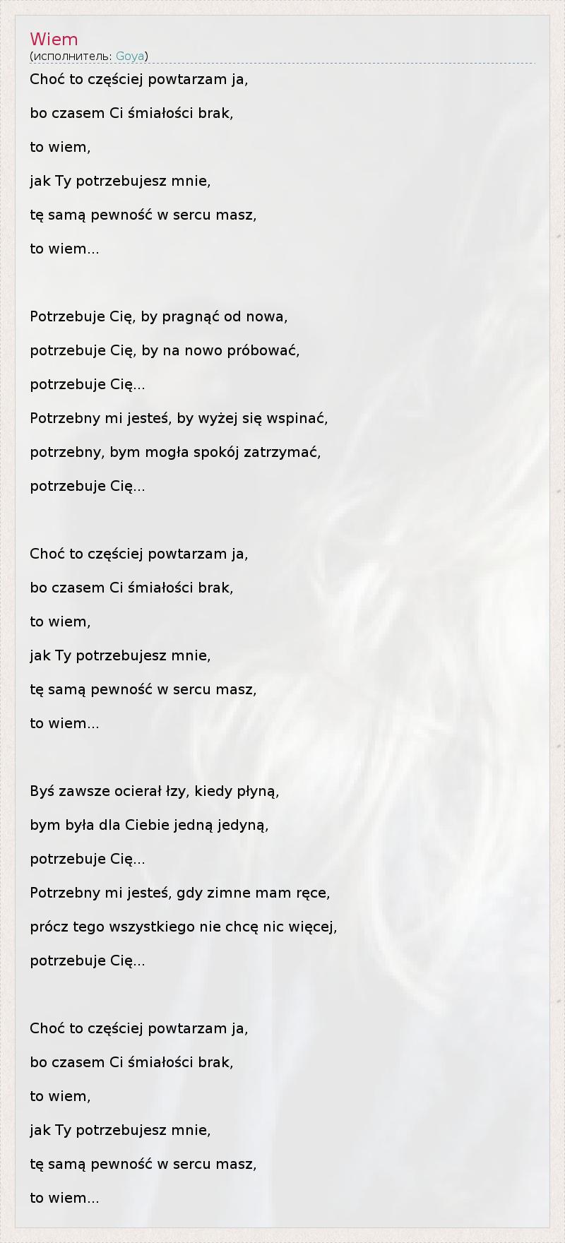 Choć to częściej powtarzam ja, bo czasem Ci śmiałości brak, to wiem, jak Ty potrzebujesz mnie, tę samą pewność w sercu masz, to wiem... Potrzebuje Cię, by pragnąć od nowa, potrzebuje Cię, by na nowo próbować, potrzebuje Cię... Potrzebny mi jesteś, by wyżej się wspinać, potrzebny, bym mogła spokój zatrzymać, potrzebuje Cię... Choć to częściej powtarzam ja, bo czasem Ci śmiałości brak, to wiem, jak Ty potrzebujesz mnie, tę samą pewność w sercu masz, to wiem... Byś zawsze ocierał łzy, kiedy płyną, bym była dla Ciebie jedną jedyną, potrzebuje Cię... Potrzebny mi jesteś, gdy zimne mam ręce, prócz tego wszystkiego nie chcę nic więcej, potrzebuje Cię... Choć to częściej powtarzam ja, bo czasem Ci śmiałości brak, to wiem, jak Ty potrzebujesz mnie, tę samą pewność w sercu masz, to wiem...