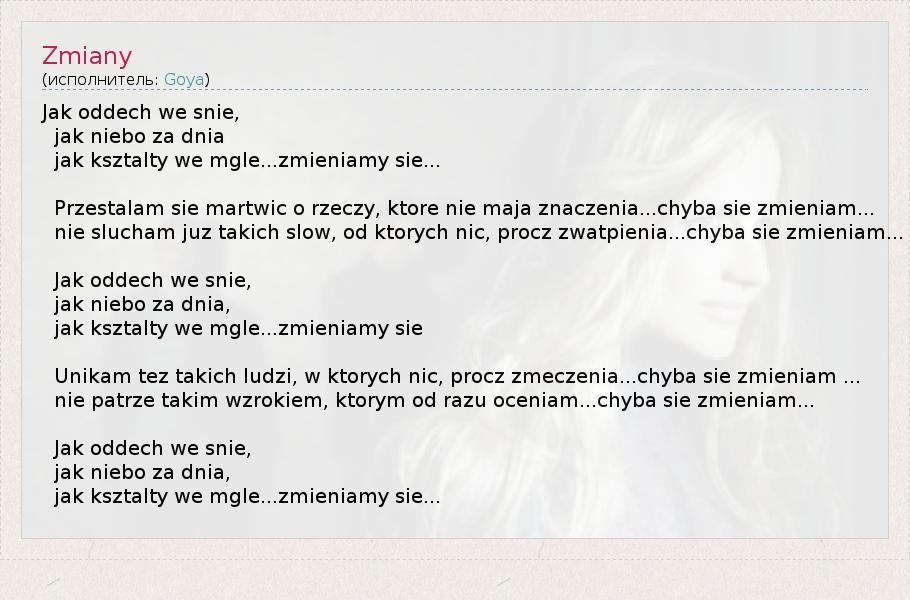 Jak oddech we snie, jak niebo za dnia jak ksztalty we mgle...zmieniamy sie... Przestalam sie martwic o rzeczy, ktore nie maja znaczenia...chyba sie zmieniam... nie slucham juz takich slow, od ktorych nic, procz zwatpienia...chyba sie zmieniam... Jak oddech we snie, jak niebo za dnia, jak ksztalty we mgle...zmieniamy sie Unikam tez takich ludzi, w ktorych nic, procz zmeczenia...chyba sie zmieniam ... nie patrze takim wzrokiem, ktorym od razu oceniam...chyba sie zmieniam... Jak oddech we snie, jak niebo za dnia, jak ksztalty we mgle...zmieniamy sie...