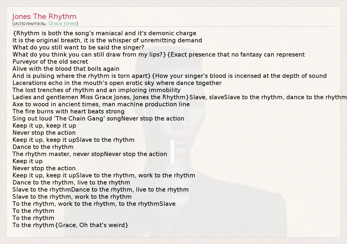 Ladies and gentlemen Miss Grace Jones, Jones the Rhythm}Slave, slaveSlave to the rhythm, dance to the rhythm