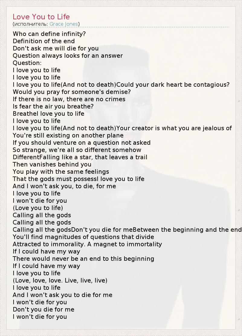 Who can define infinity? Definition of the end Don't ask me will die for you Question always looks for an answer Question: I love you to life I love you to life I love you to life(And not to death)Could your dark heart be contagious? Would you pray for someone's demise? If there is no law, there are no crimes Is fear the air you breathe? BreatheI love you to life I love you to life I love you to life(And not to death)Your creator is what you are jealous of You're still existing on another plane If you should venture on a question not asked So strange, we're all so different somehow DifferentFalling like a star, that leaves a trail Then vanishes behind you You play with the same feelings That the gods must possessI love you to life And I won't ask you, to die, for me I love you to life I won't die for you (Love you to life) Calling all the gods Calling all the gods Calling all the godsDon't you die for meBetween the beginning and the end You'll find magnitudes of questions that divide Attracted to immorality. A magnet to immortality If I could have my way There would never be an end to this beginning If I could have my way I love you to life (Love, love, love. Live, live, live) I love you to life And I won't ask you to die for me I won't die for you Don't you die for me I won't die for you