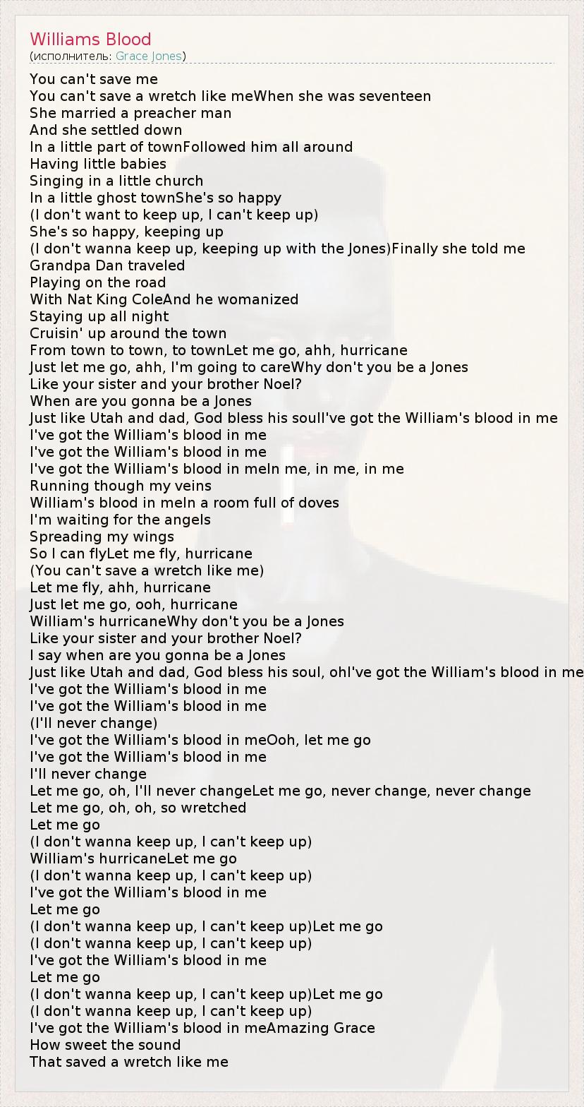 You can't save me You can't save a wretch like meWhen she was seventeen She married a preacher man And she settled down In a little part of townFollowed him all around Having little babies Singing in a little church In a little ghost townShe's so happy (I don't want to keep up, I can't keep up) She's so happy, keeping up (I don't wanna keep up, keeping up with the Jones)Finally she told me Grandpa Dan traveled Playing on the road With Nat King ColeAnd he womanized Staying up all night Cruisin' up around the town From town to town, to townLet me go, ahh, hurricane Just let me go, ahh, I'm going to careWhy don't you be a Jones Like your sister and your brother Noel? When are you gonna be a Jones Just like Utah and dad, God bless his soulI've got the William's blood in me I've got the William's blood in me I've got the William's blood in me I've got the William's blood in meIn me, in me, in me Running though my veins William's blood in meIn a room full of doves I'm waiting for the angels Spreading my wings So I can flyLet me fly, hurricane (You can't save a wretch like me) Let me fly, ahh, hurricane Just let me go, ooh, hurricane William's hurricaneWhy don't you be a Jones Like your sister and your brother Noel? I say when are you gonna be a Jones Just like Utah and dad, God bless his soul, ohI've got the William's blood in me I've got the William's blood in me I've got the William's blood in me (I'll never change) I've got the William's blood in meOoh, let me go I've got the William's blood in me I'll never change Let me go, oh, I'll never changeLet me go, never change, never change Let me go, oh, oh, so wretched Let me go (I don't wanna keep up, I can't keep up) William's hurricaneLet me go (I don't wanna keep up, I can't keep up) I've got the William's blood in me Let me go (I don't wanna keep up, I can't keep up)Let me go (I don't wanna keep up, I can't keep up) I've got the William's blood in me Let me go (I don't wanna keep up, I can't keep up)Let me go (I don't wanna keep up, I can't keep up) I've got the William's blood in meAmazing Grace How sweet the sound That saved a wretch like me