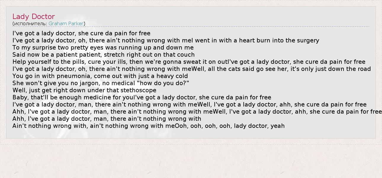 I've got a lady doctor, man, there ain't nothing wrong with meWell, I've got a lady doctor, ahh, she cure da pain for free