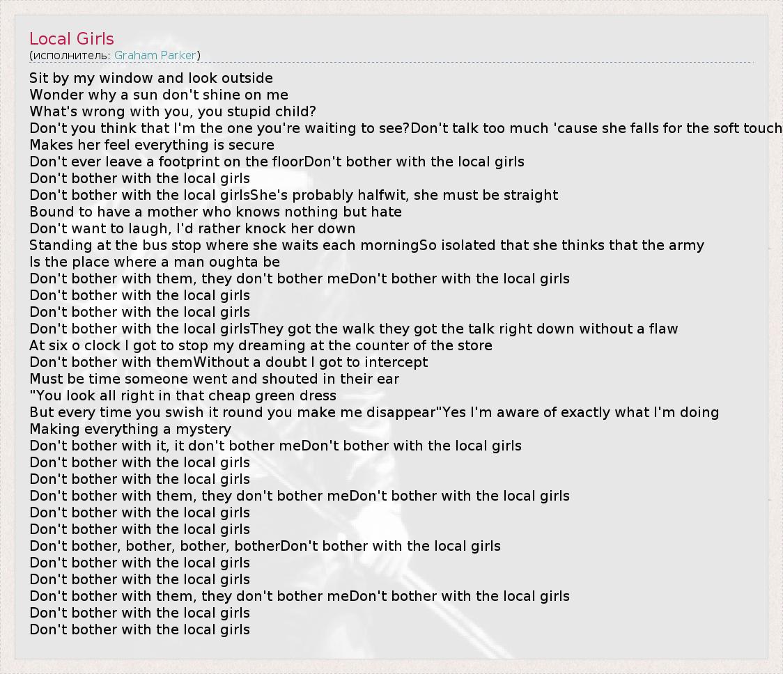 Sit by my window and look outside Wonder why a sun don't shine on me What's wrong with you, you stupid child? Don't you think that I'm the one you're waiting to see?Don't talk too much 'cause she falls for the soft touch Makes her feel everything is secure Don't ever leave a footprint on the floorDon't bother with the local girls Don't bother with the local girls Don't bother with the local girlsShe's probably halfwit, she must be straight Bound to have a mother who knows nothing but hate Don't want to laugh, I'd rather knock her down Standing at the bus stop where she waits each morningSo isolated that she thinks that the army Is the place where a man oughta be Don't bother with them, they don't bother meDon't bother with the local girls Don't bother with the local girls Don't bother with the local girls Don't bother with the local girlsThey got the walk they got the talk right down without a flaw At six o clock I got to stop my dreaming at the counter of the store Don't bother with themWithout a doubt I got to intercept Must be time someone went and shouted in their ear "You look all right in that cheap green dress But every time you swish it round you make me disappear"Yes I'm aware of exactly what I'm doing Making everything a mystery Don't bother with it, it don't bother meDon't bother with the local girls Don't bother with the local girls Don't bother with the local girls Don't bother with them, they don't bother meDon't bother with the local girls Don't bother with the local girls Don't bother with the local girls Don't bother, bother, bother, botherDon't bother with the local girls Don't bother with the local girls Don't bother with the local girls Don't bother with them, they don't bother meDon't bother with the local girls Don't bother with the local girls Don't bother with the local girls