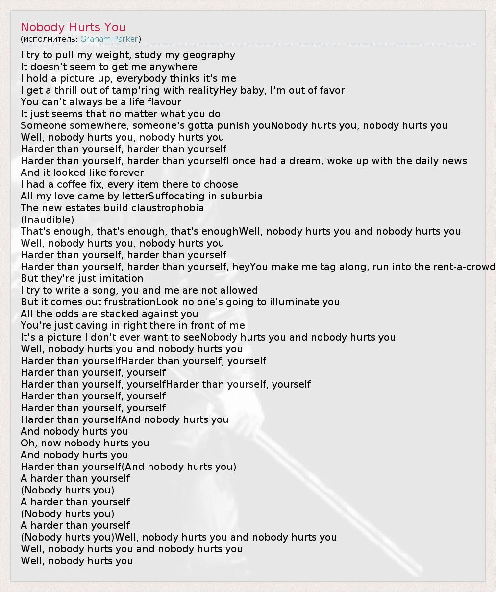 (Nobody hurts you)Well, nobody hurts you and nobody hurts you