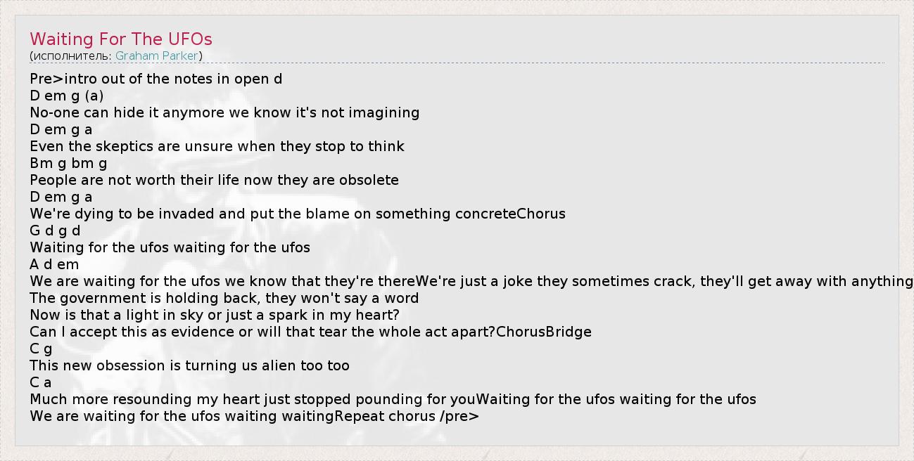 We are waiting for the ufos waiting	waitingRepeat chorus /pre>