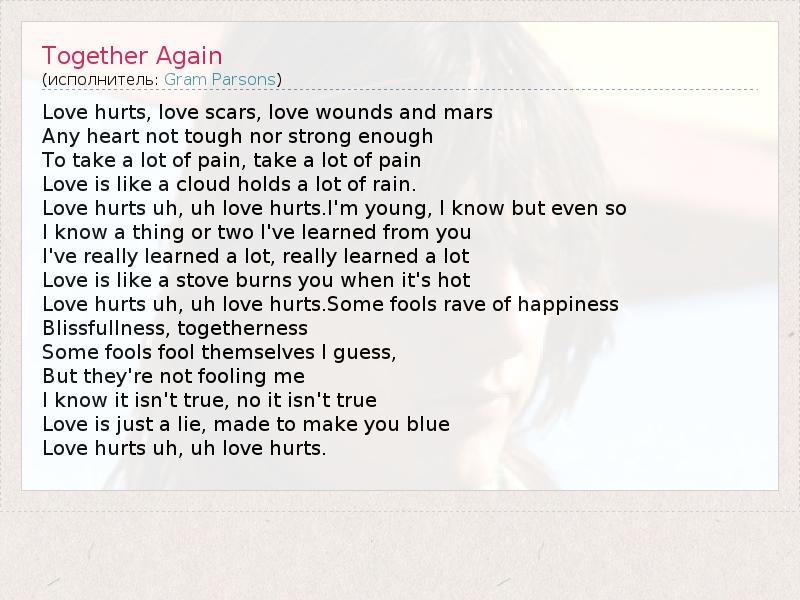Love hurts, love scars, love wounds and mars Any heart not tough nor strong enough To take a lot of pain, take a lot of pain Love is like a cloud holds a lot of rain. Love hurts uh, uh love hurts.I'm young, I know but even so I know a thing or two I've learned from you I've really learned a lot, really learned a lot Love is like a stove burns you when it's hot Love hurts uh, uh love hurts.Some fools rave of happiness Blissfullness, togetherness Some fools fool themselves I guess, But they're not fooling me I know it isn't true, no it isn't true Love is just a lie, made to make you blue Love hurts uh, uh love hurts.