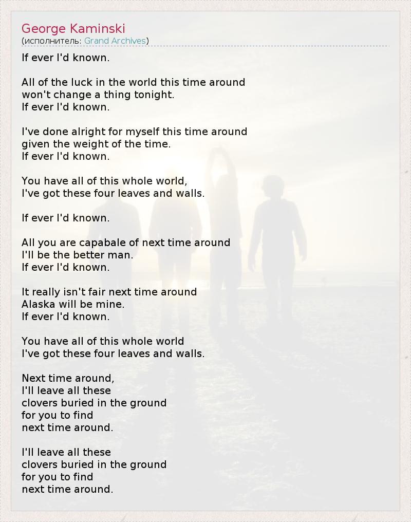 If ever I'd known. All of the luck in the world this time around won't change a thing tonight. If ever I'd known. I've done alright for myself this time around given the weight of the time. If ever I'd known. You have all of this whole world, I've got these four leaves and walls. If ever I'd known. All you are capabale of next time around I'll be the better man. If ever I'd known. It really isn't fair next time around Alaska will be mine. If ever I'd known. You have all of this whole world I've got these four leaves and walls. Next time around, I'll leave all these clovers buried in the ground for you to find next time around. I'll leave all these clovers buried in the ground for you to find next time around.